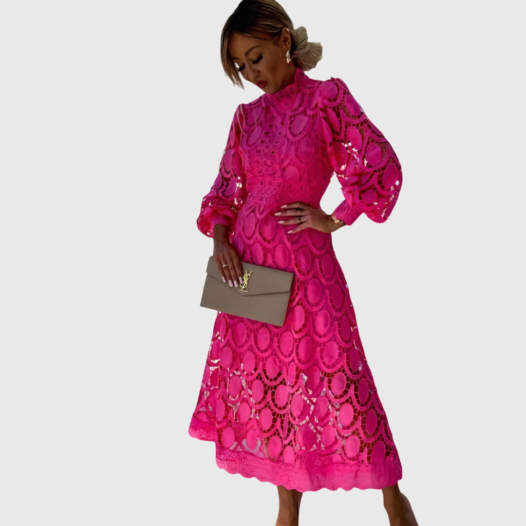 הקישוטים העדינים והשרוולים הארוכים והקצת נפוחים מעניקים לשמלה נופך של יוקרה. הצווארון הגבוה מספק מראה נצחי של nunca יוצא מהאופנה.