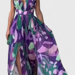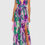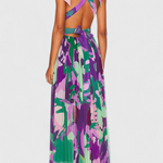השמלה ססיל היא יצירת אמנות של ממש, שמשלבת הדפסים אמנותיים בגווני סגול וירוק עם סילואטה קלילה ופתוחה. היא נועדה לנוע באלגנטיות עם כל צעד שלך, והחזית המודגשת והגב החשוף מוסיפים לה נופך ייחודי ומיוחד.
