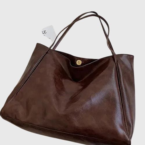 תיק יד עור חום אלגנטי עם סגירת זהב