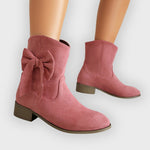מגפיים קצרים לנשים בסגנון אופנתי – גימור זמש – עקב נמוך – קשת דקורטיבית – מתאים לנוחות מבית Couture-Moda. מגפיים אלה עשויים חומר שמזכיר זמש ומכילים פרטי קשת אלגנטיים ועקב נמוך לנוחות לאורך כל היום. השילוב המושלם של אופנה ופונקציה לסגנון יומיומי!