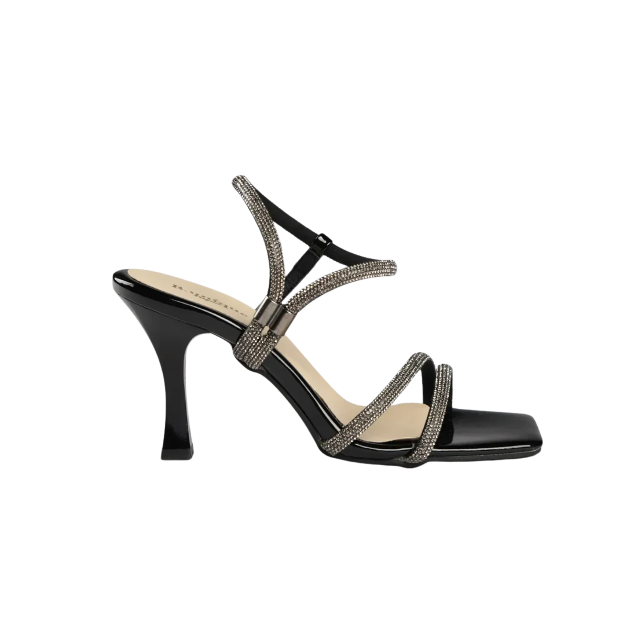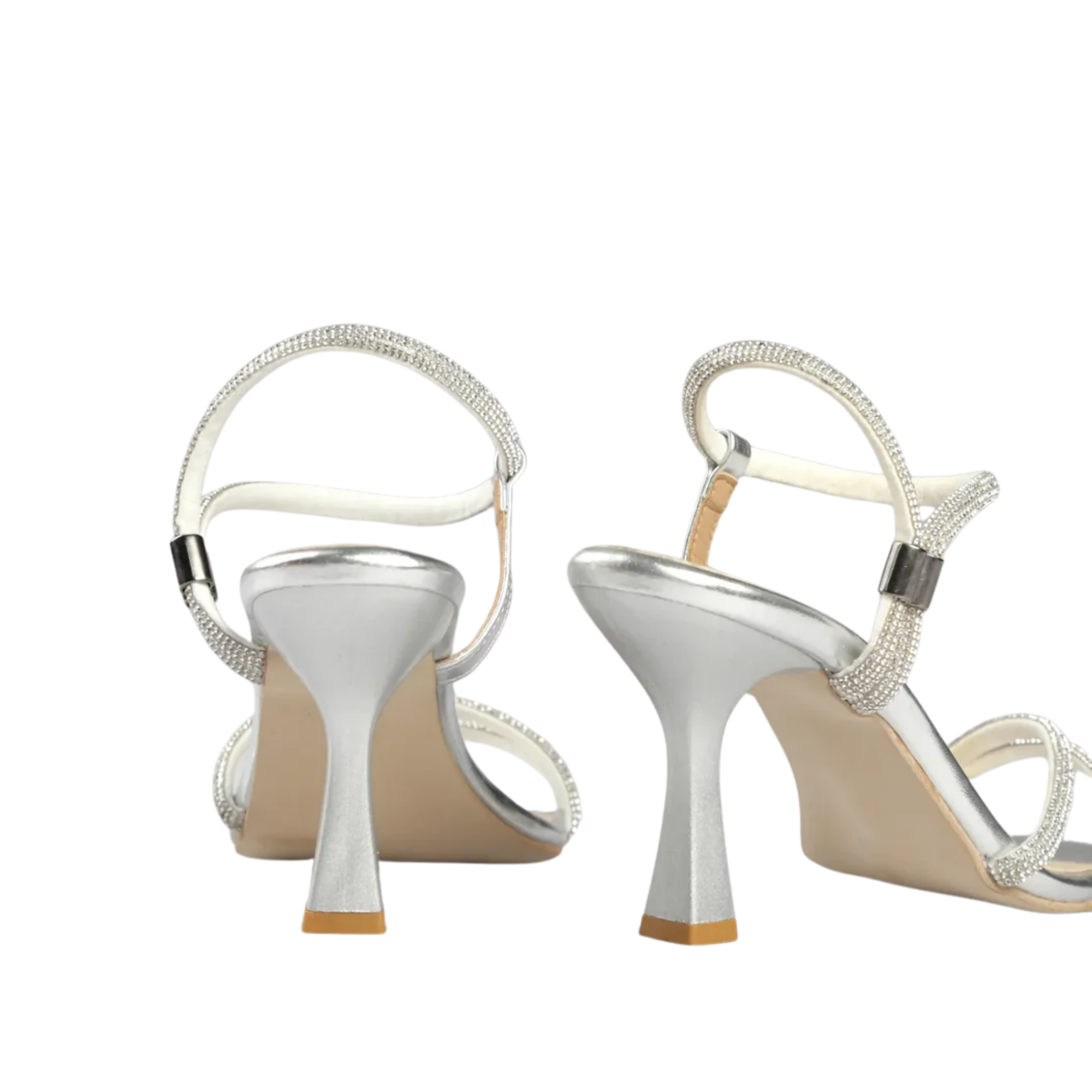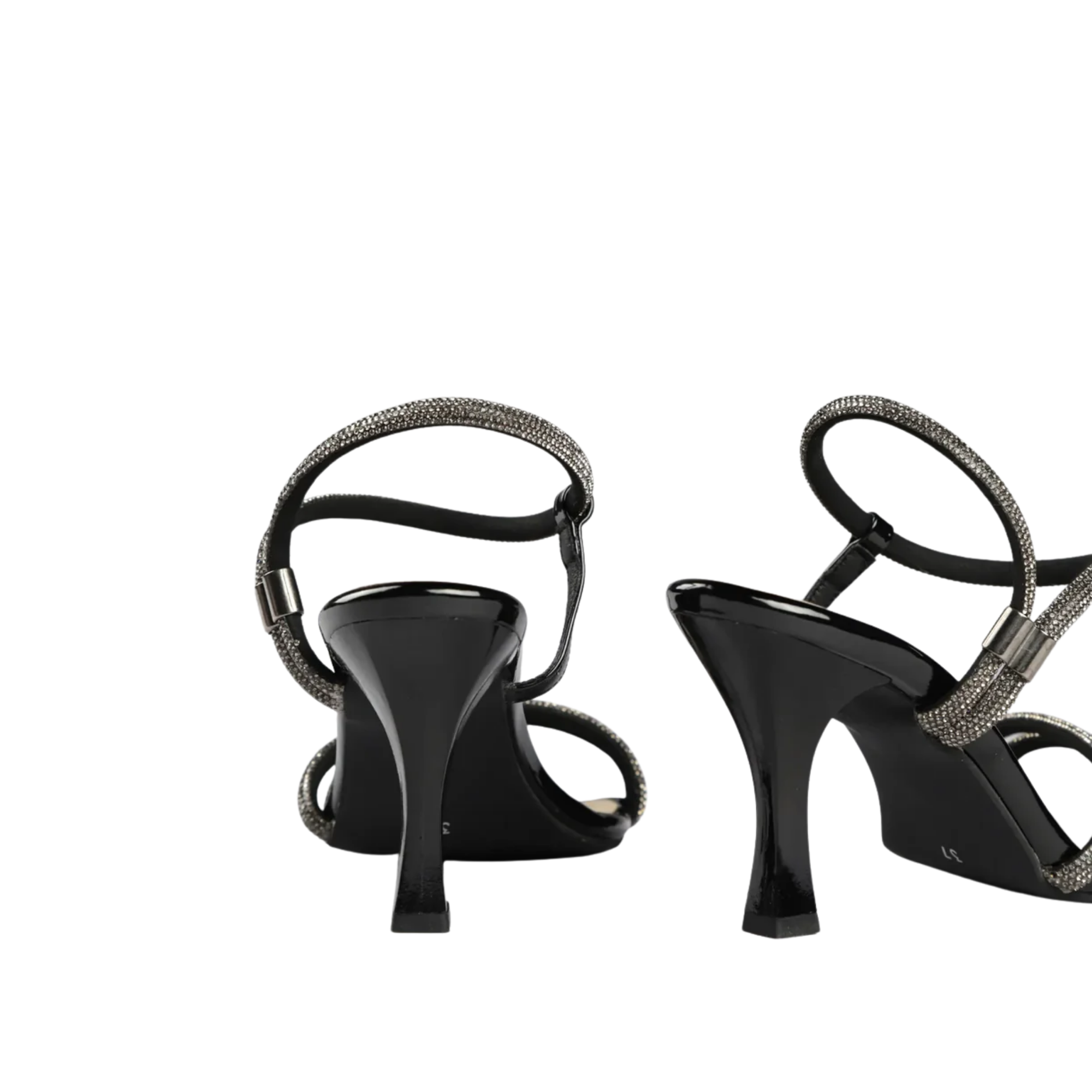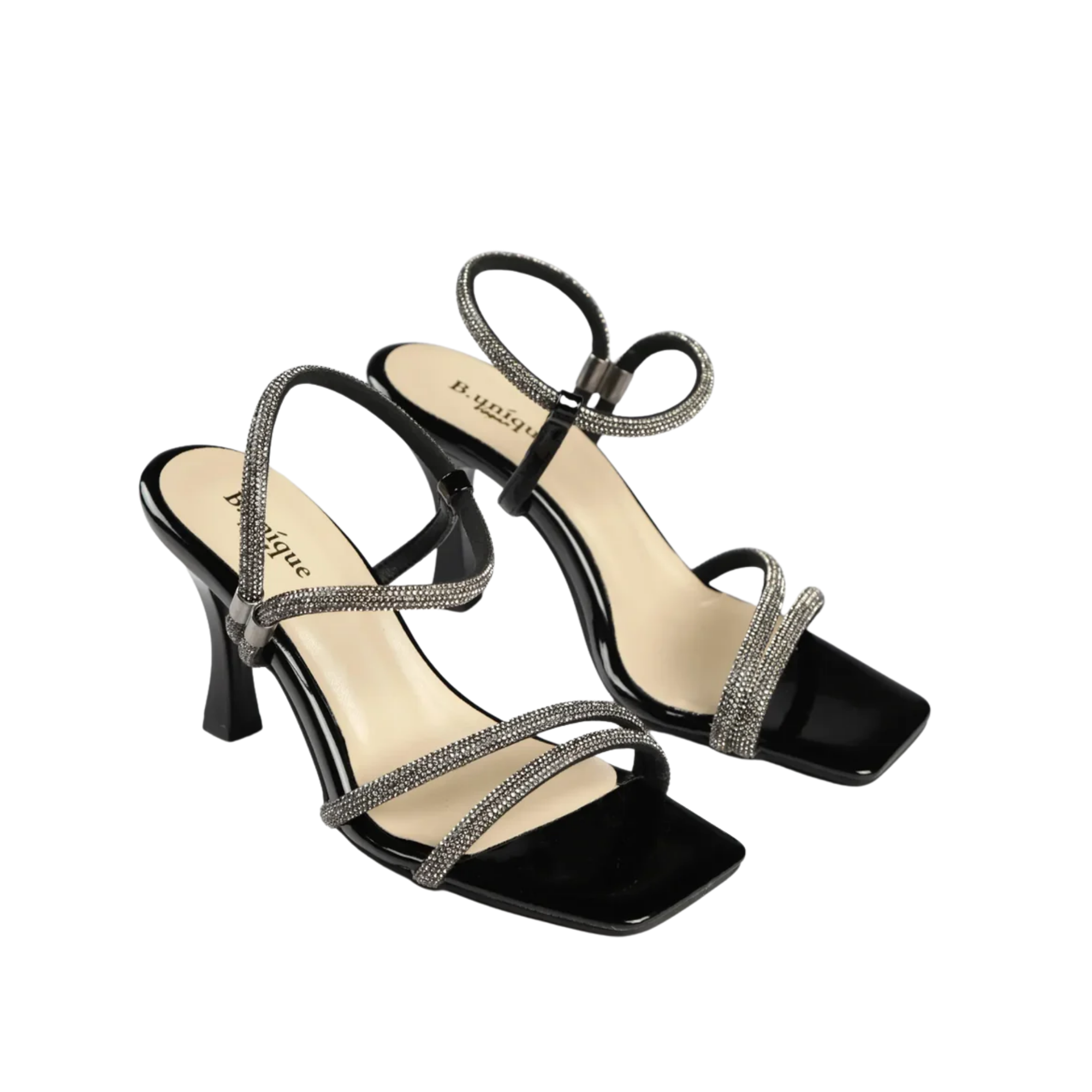 סנדלים שיקיים ואלגנטיים בעלי רצועות מעוגלות ועקב גבוה ונוח, יתאימו בול לשמלת ערב יוקרתית או אאוטפיט מוקפד למסיבה. עשויים חומר דמוי עור בשילוב אבנים