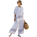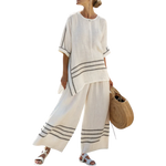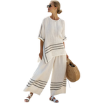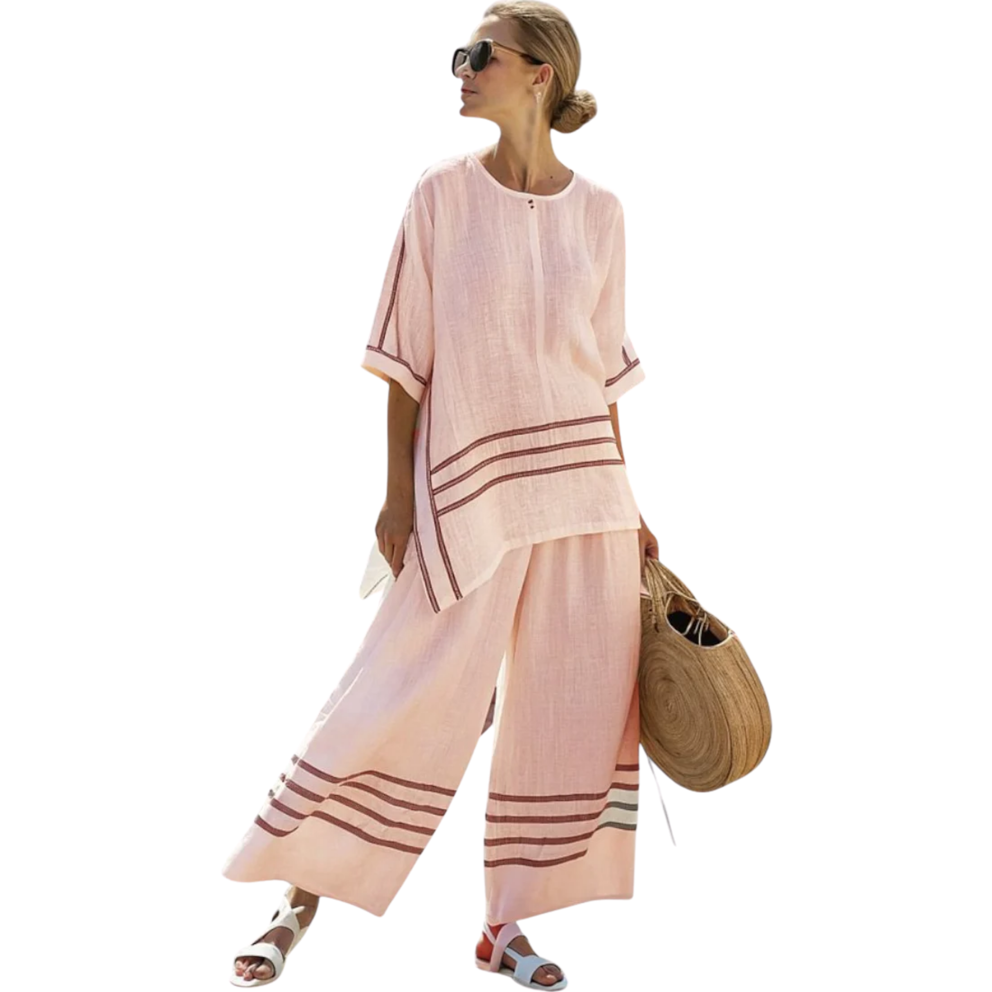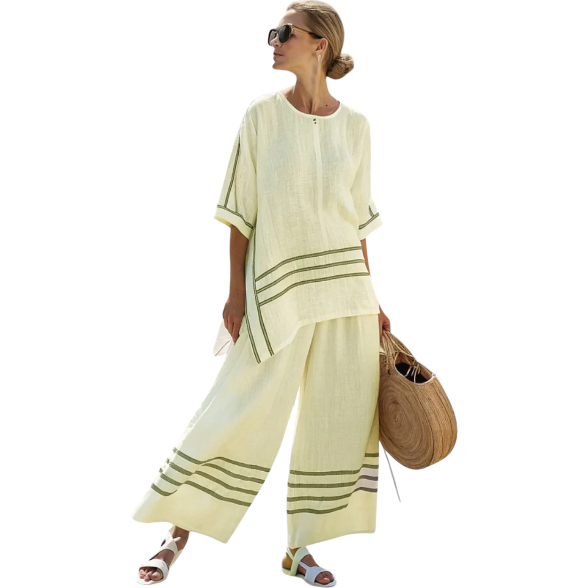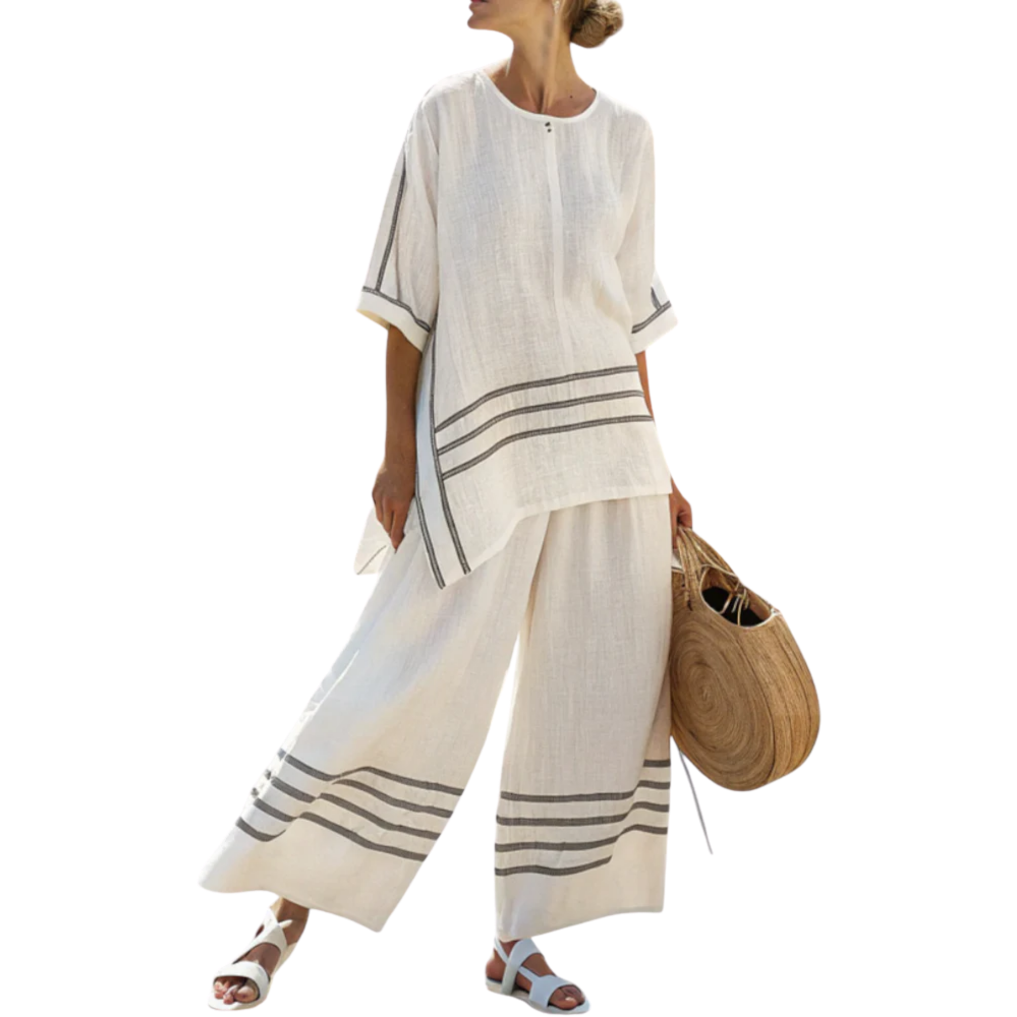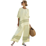 סגנון קיץ ללא מאמץ – סט מכנסיים רחבים מפוספסים המשלב קסם ים-תיכוני עם נוחות מודרנית.