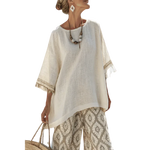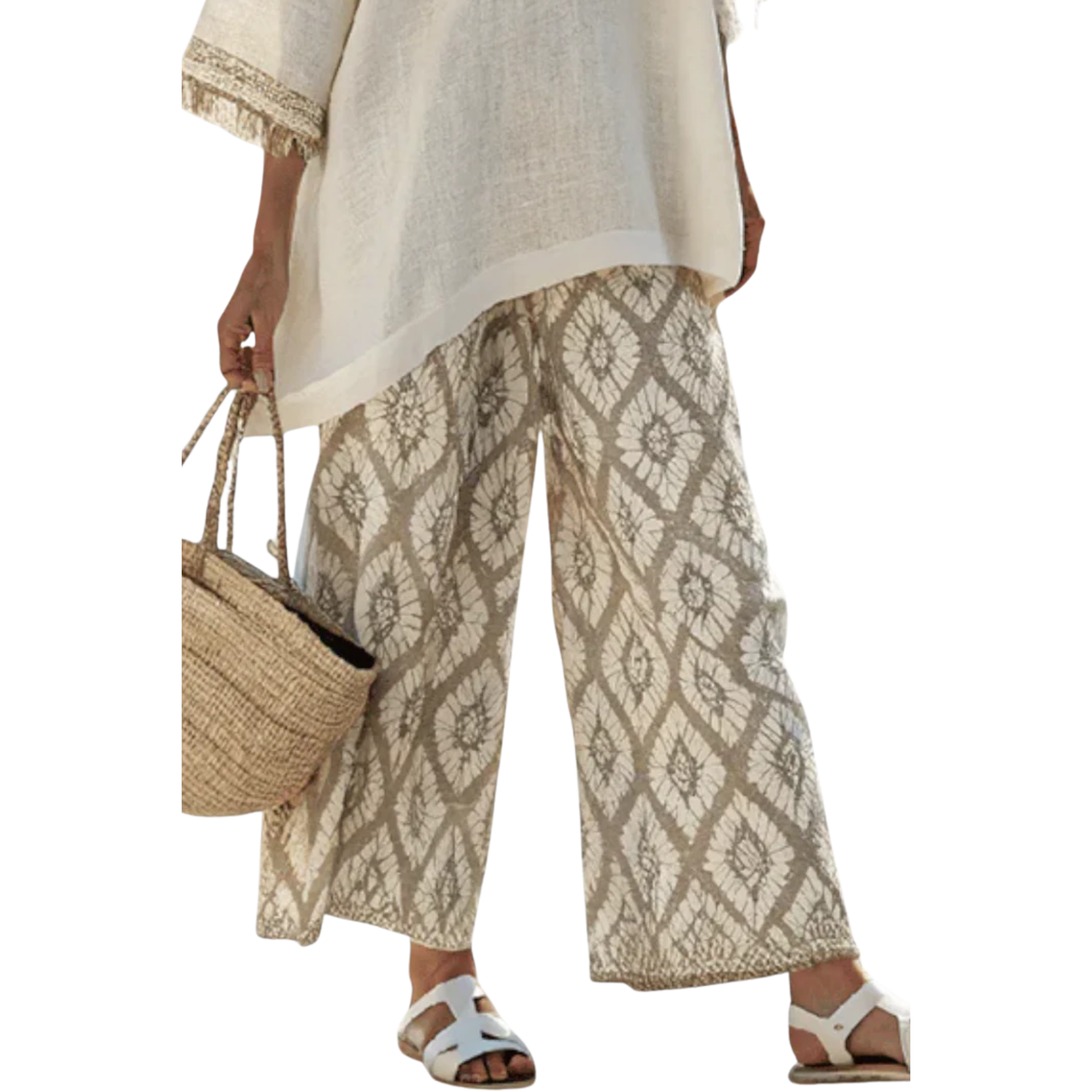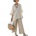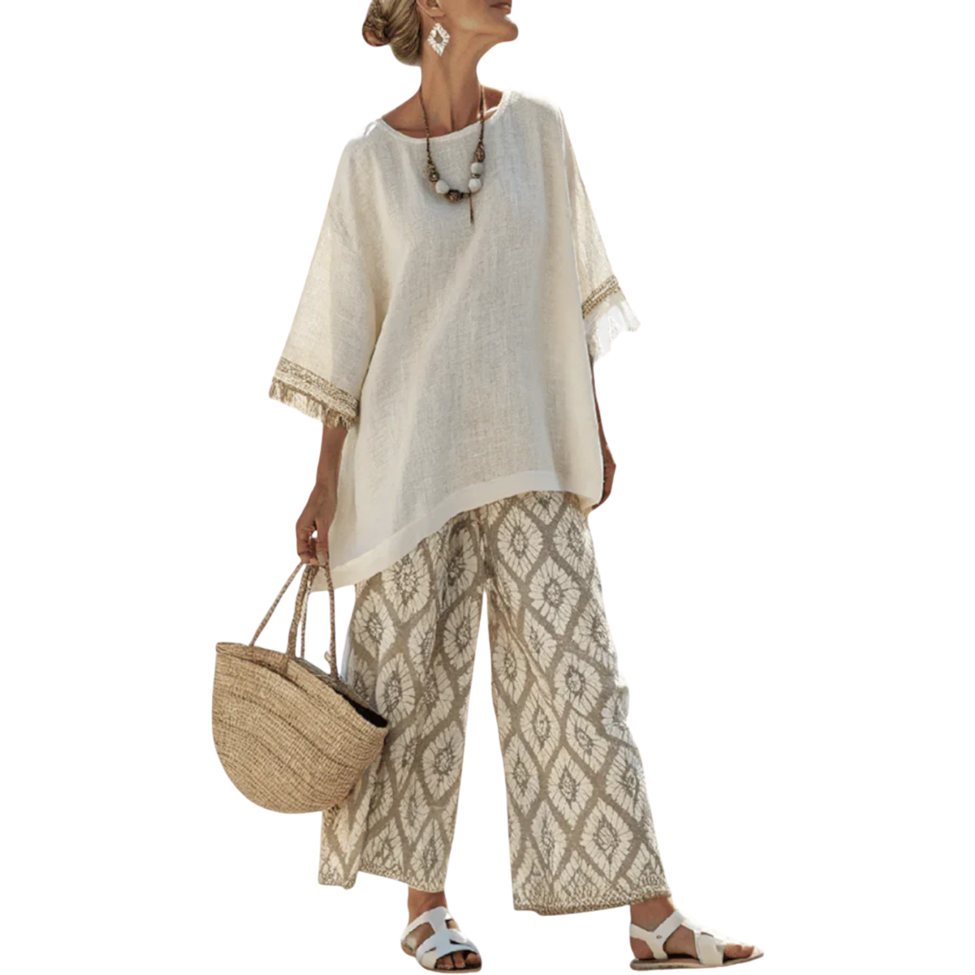 חולצה אוורירית ומכנסיים רחבים המשלבים אלגנטיות נינוחה עם נגיעות אמנותיות — החבר המושלם לימי שמש מוארים.