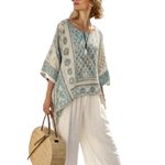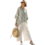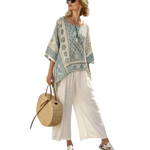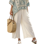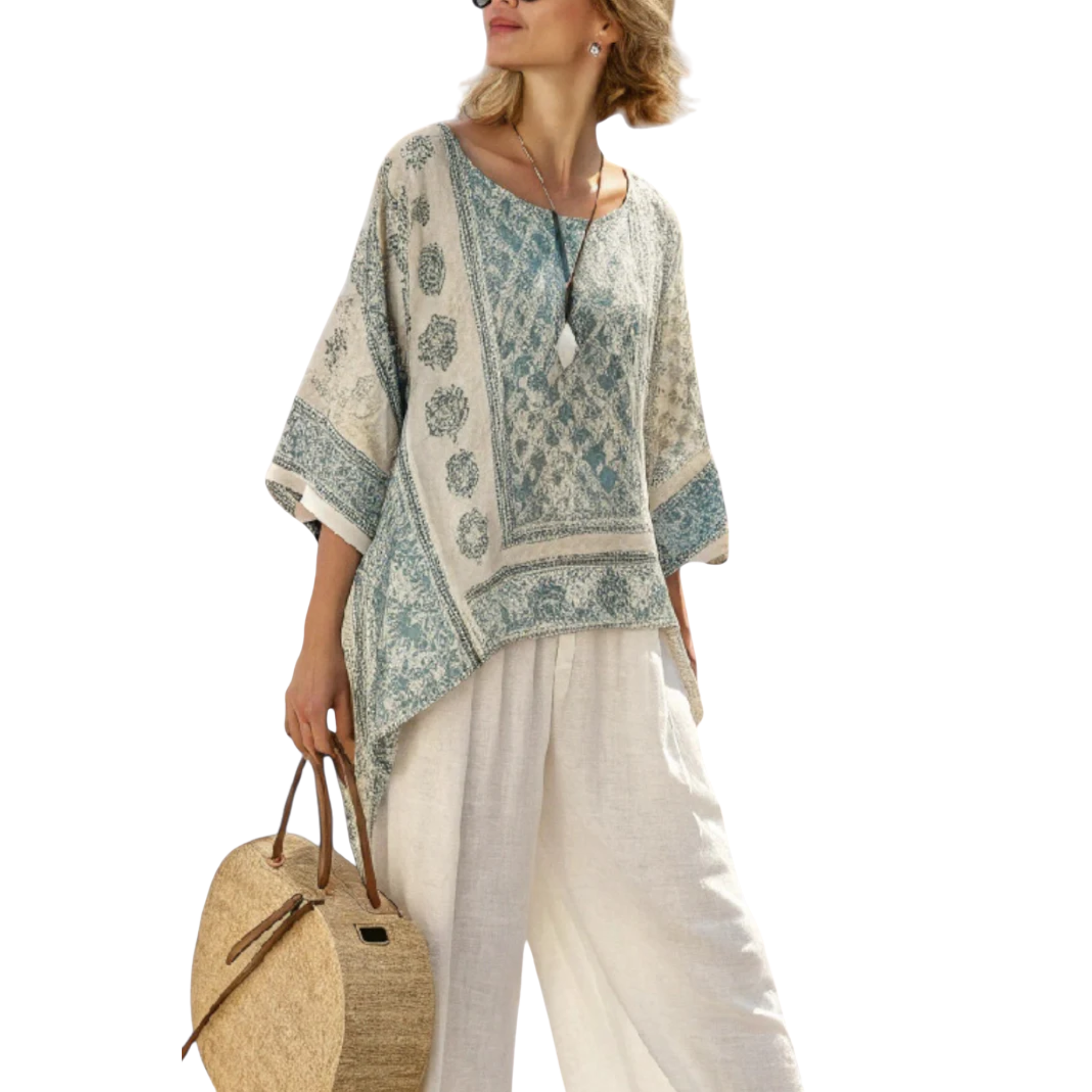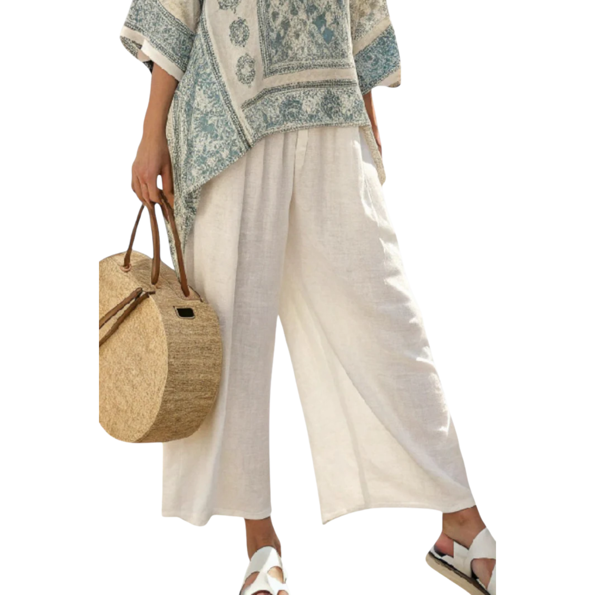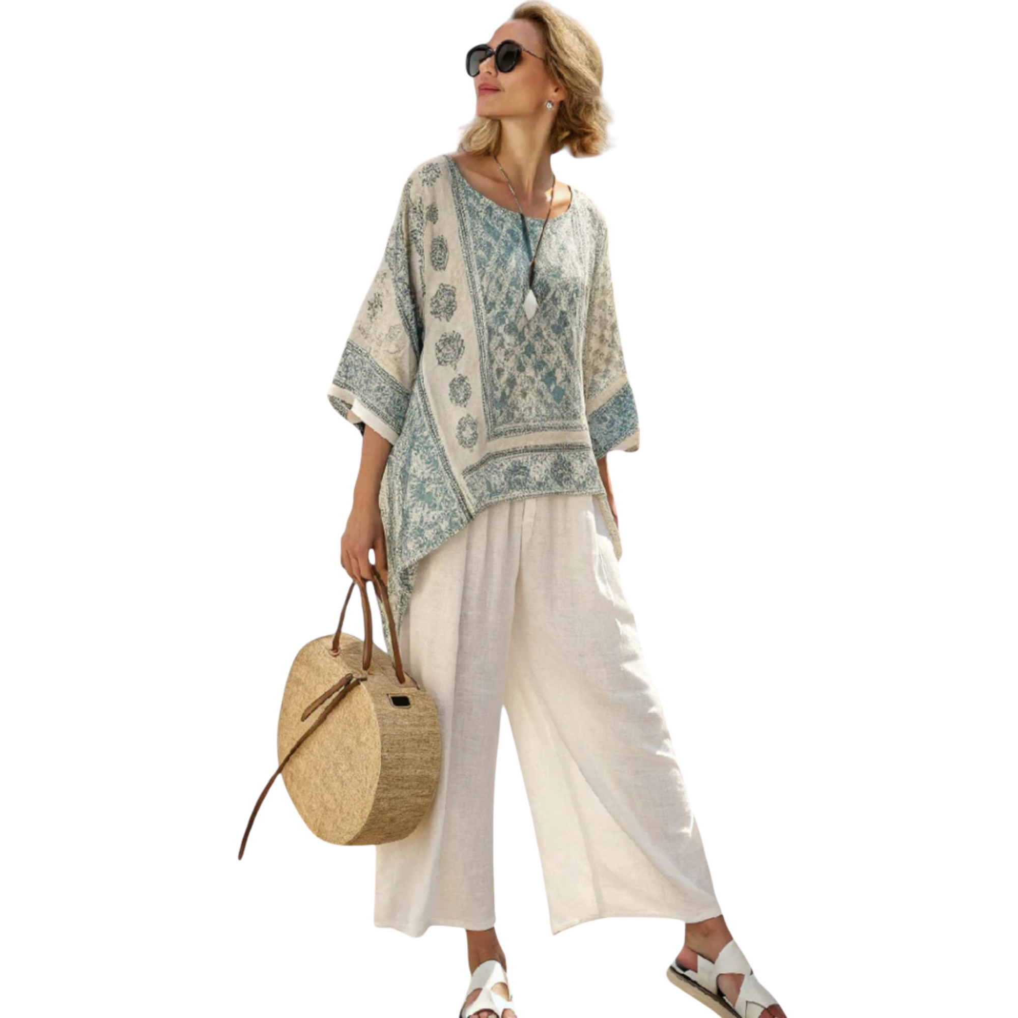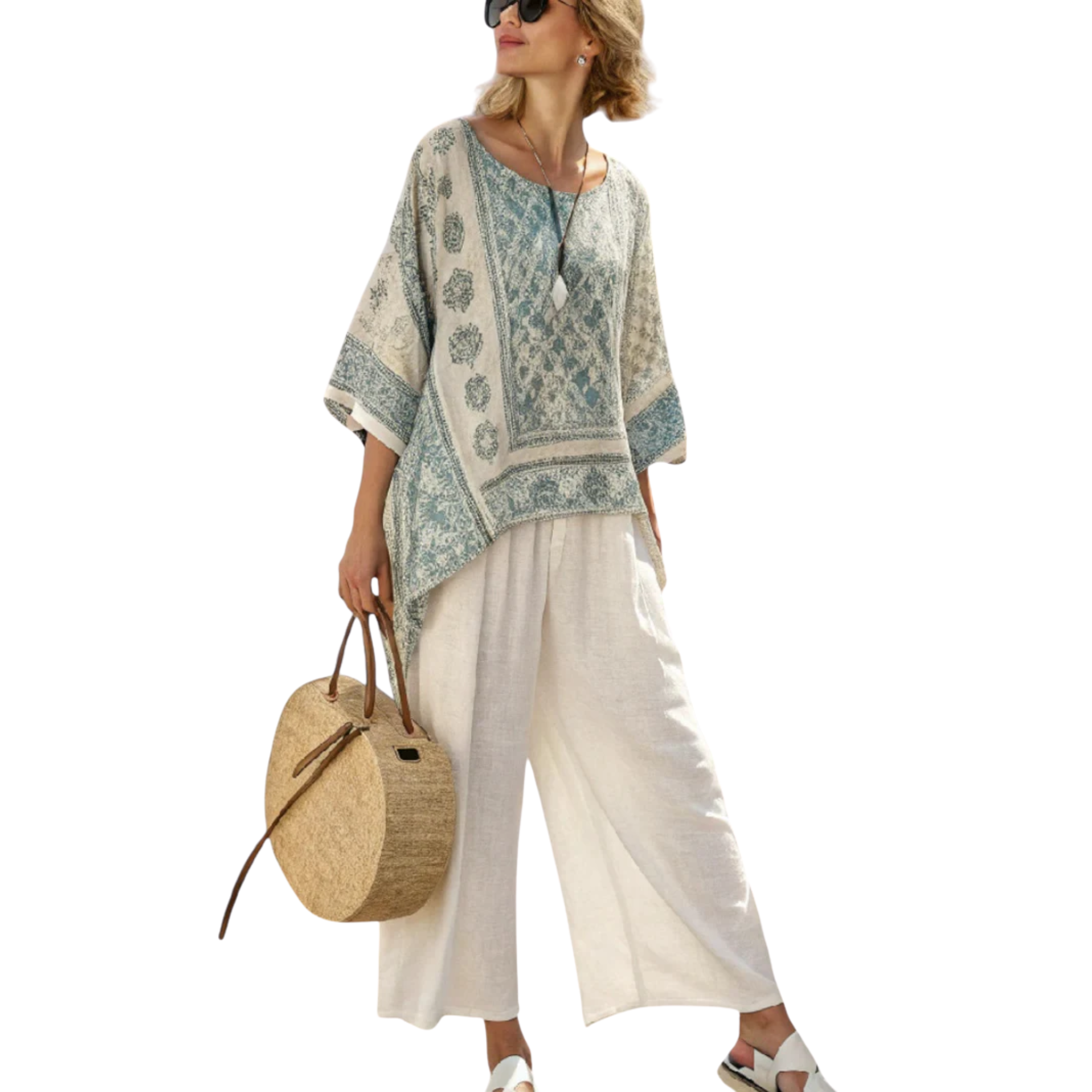 סט קליל ואוורירי המשלב חולצה מודפסת זורמת עם מכנסיים לבנים רחבי־רגל, ללכידת רוח השיק הקיצי הנינוח.