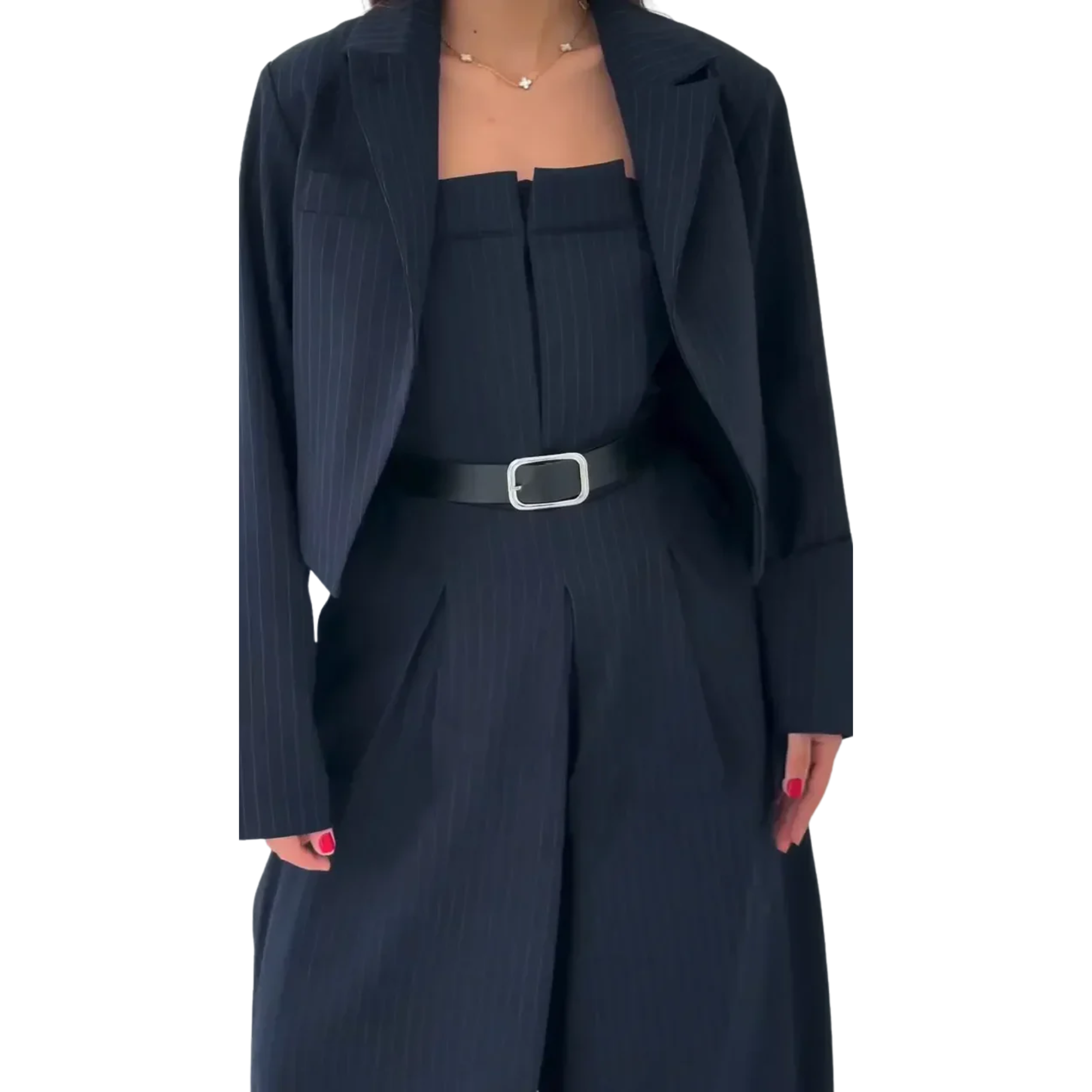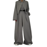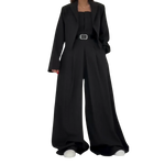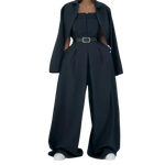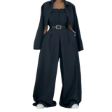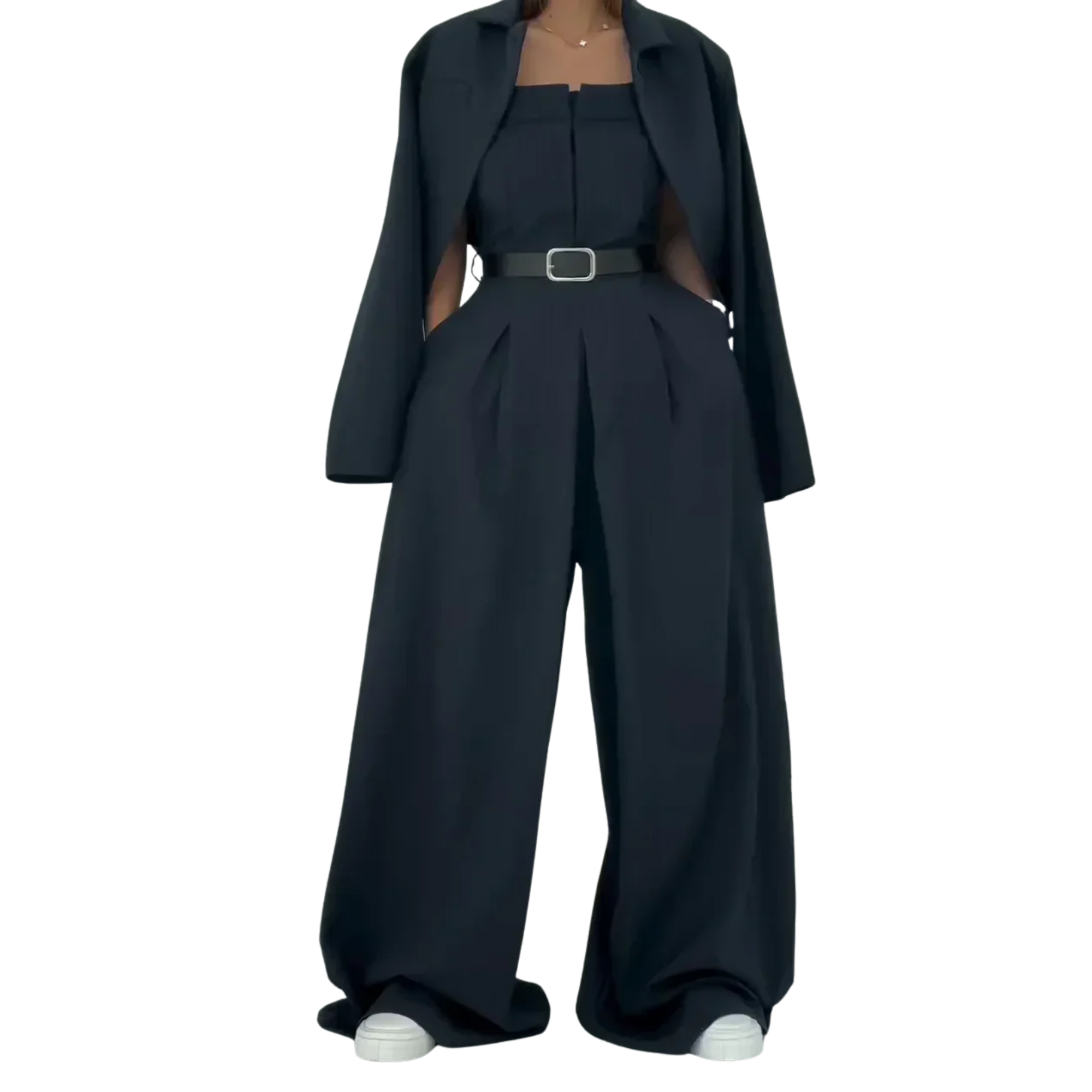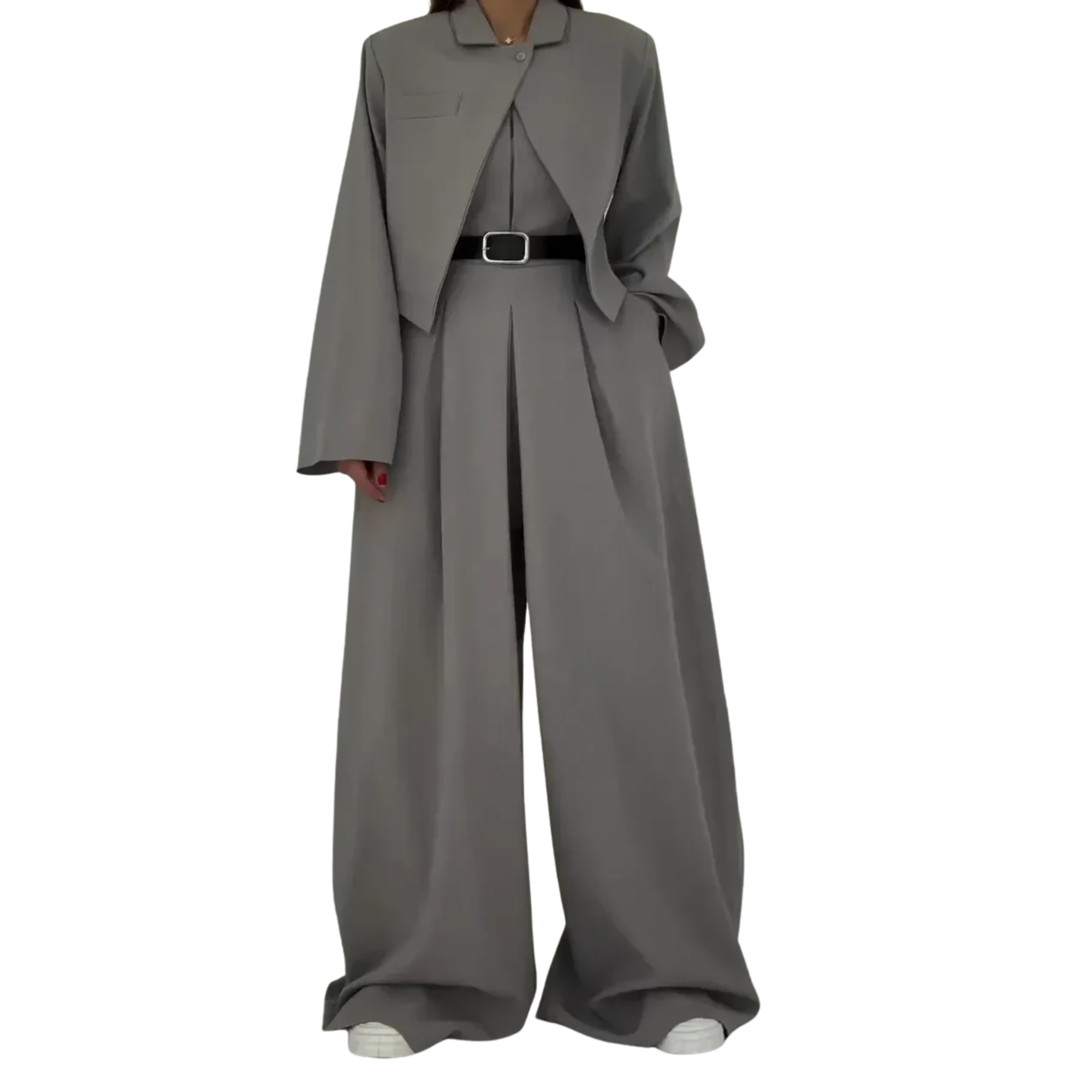 עיצוב אלגנטי ורב-שימושי – סט שני חלקים אופנתי הכולל בוסטייר מחויט, מכנסיים רחבים ובלייזר זורם, מושלם גם לעבודה וגם לאירועים מיוחדים.
