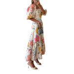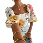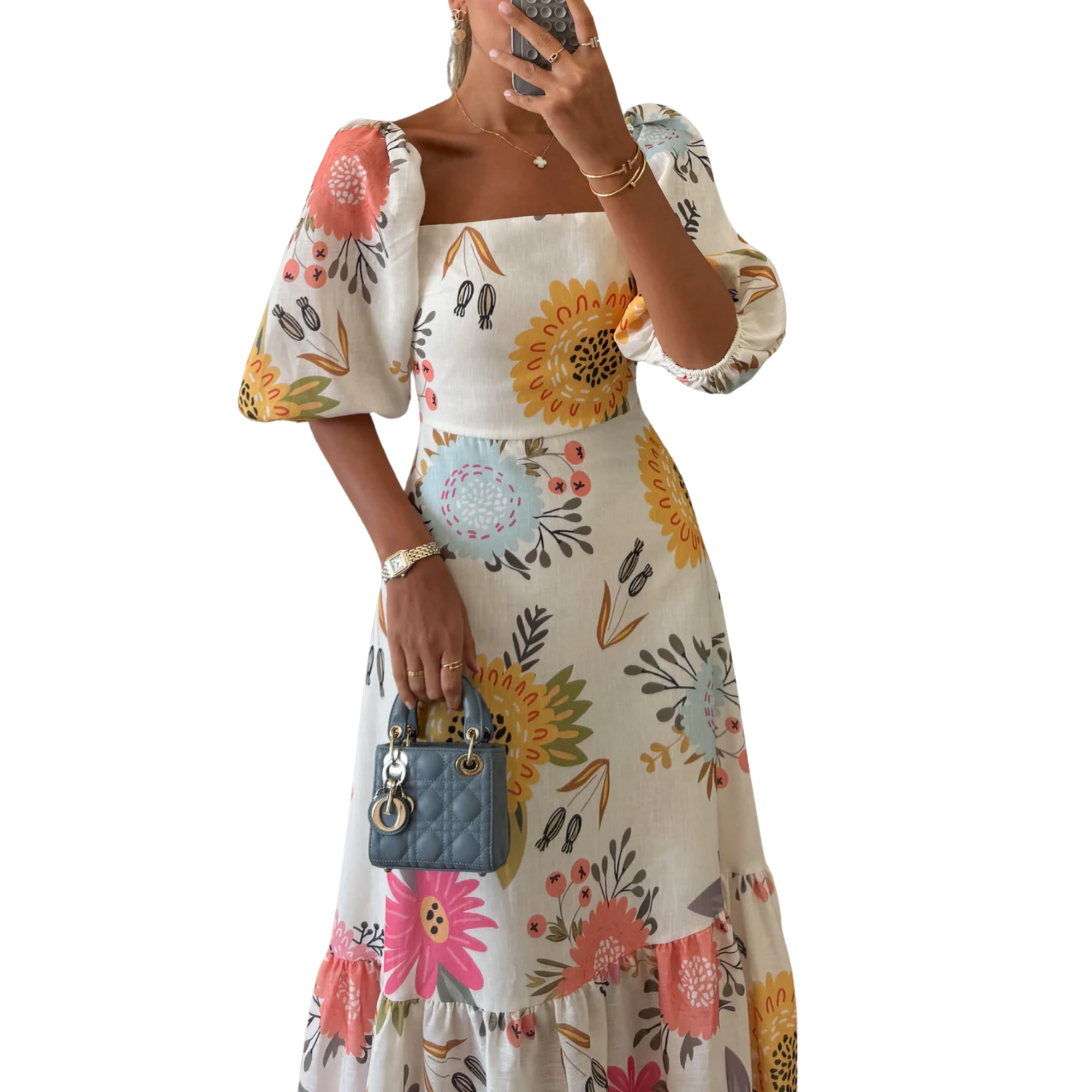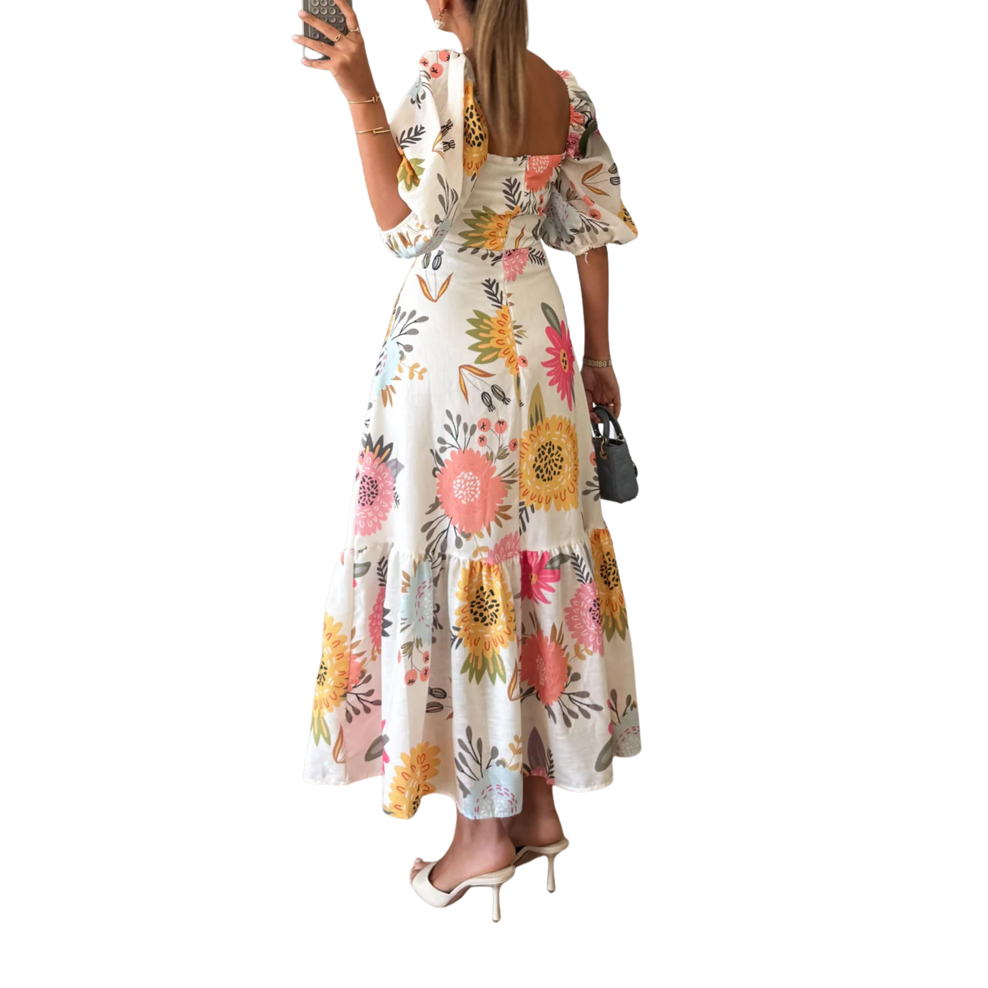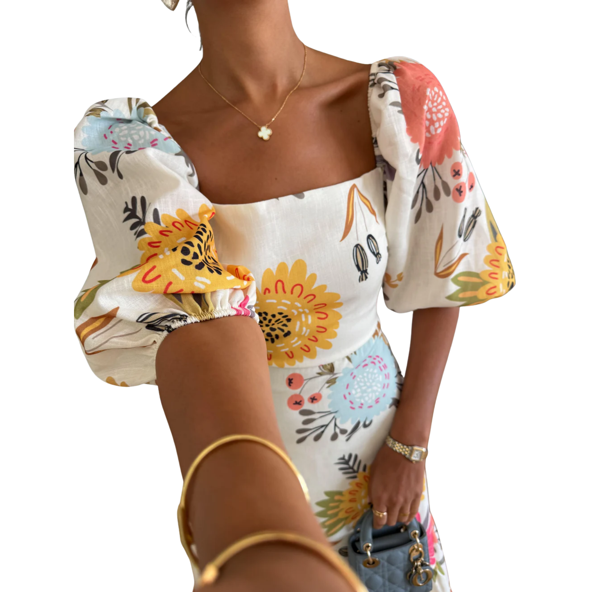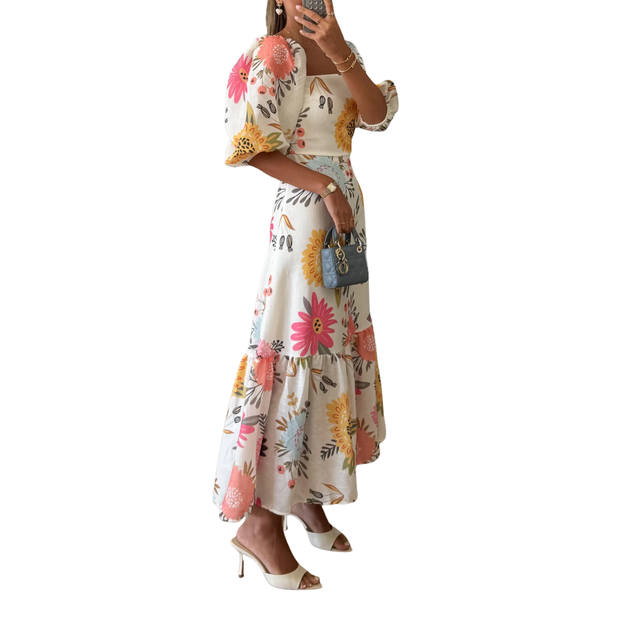 שמלת המידי הקסומה הזו לוכדת את המהות של נשיות אלגנטית וקלילה עם הדפס פרחים נועז וגזרה על-זמנית. עם מחשוף מרובע מובנה ושרוולי פאפ נפוחים, היא יוצרת שילוב מושלם בין רומנטיקה שובבה לאלגנטיות מעודנת. אידיאלית למסיבות גן, דייטים בבראנץ' או אירועי קיץ מיוחדים, השמלה מבטיחה שתמשכי מבטים בקלות.