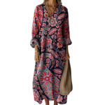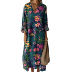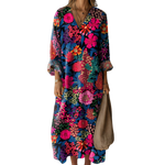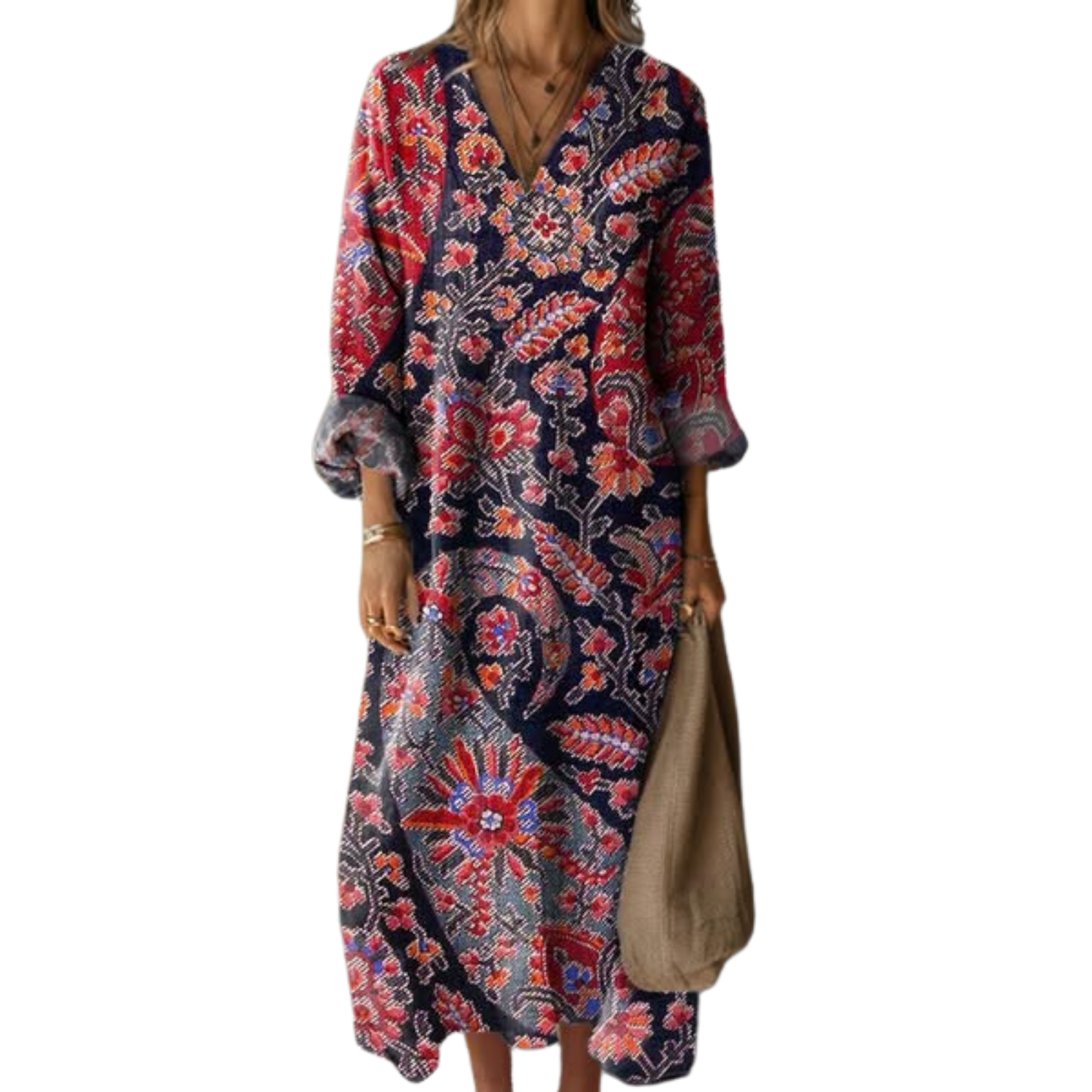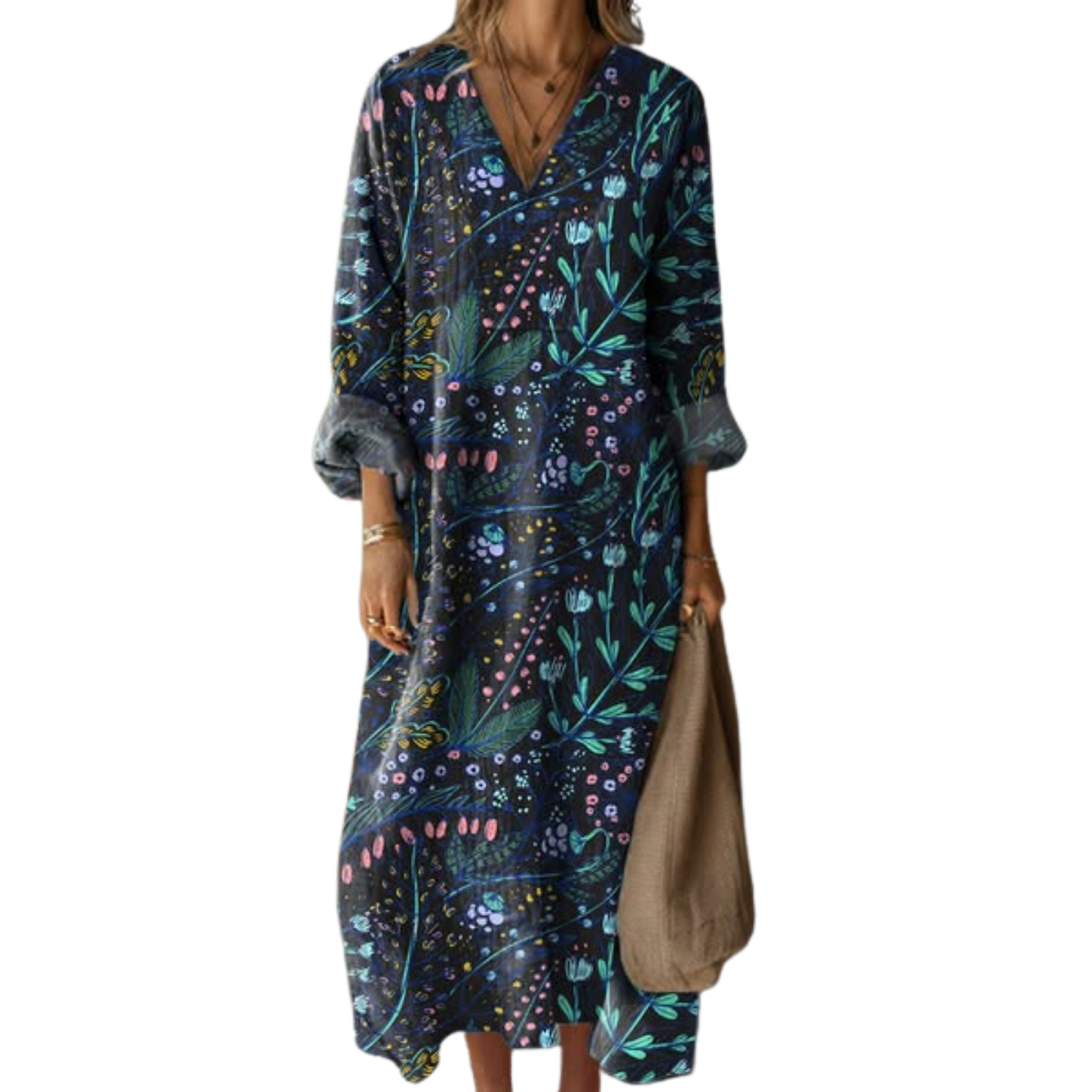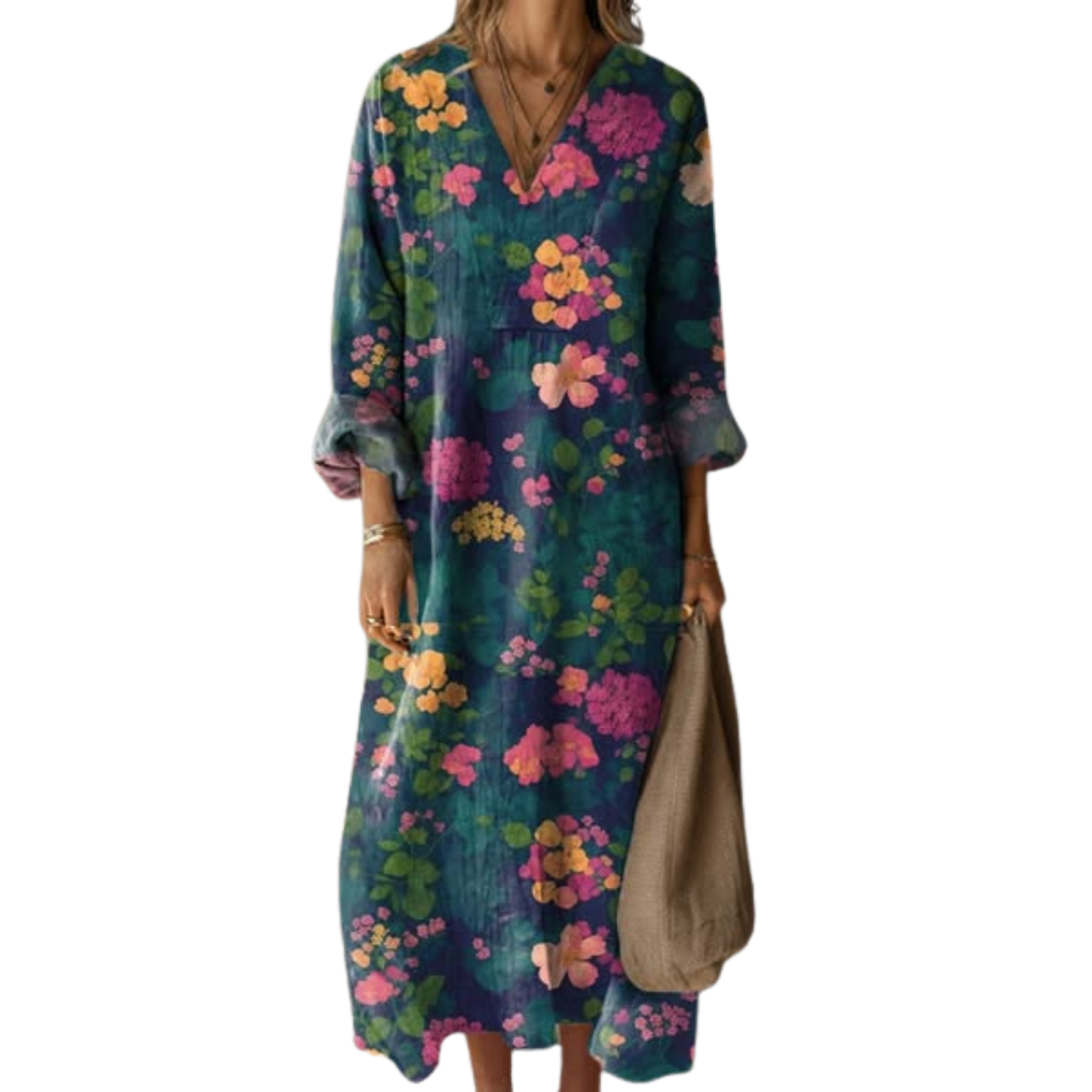 ההדפס הפרחוני העשיר בשילוב צבעים נועזים מעניק לשמלה מראה ייחודי ואלגנטי שמבליט אותך בכל אירוע.