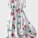 השמלה המקסי החמודה הזו מפיצה אווירה אביבית ומשחקית, עם בסיס לבן שמודגש על ידי דוגמאות פרחים צבעוניות ופרפרים עדינים. ההתאמה הנוחה שלה והמרקם הקל делают אותה אידיאלית להופעות יומיומיות ולטיולים רגועים.