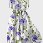 שמלות מקסי אלגנטיות זו עם בסיס לבן ופרחים סגולים משדרת רעננות ונשיות. הבד הקל והגזרה הקלה שלה הופכים אותה לאידיאלית להופעות אביביות וקיץ.