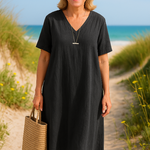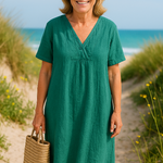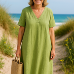 בד נושם: שמלה זו, העשויה מתערובת רכה של כותנה ופשתן, עוזרת לך להישאר קרירה ורעננה לאורך כל היום. החומר קל וידידותי לעור, מה שהופך אותו למושלם למזג אוויר חם. הוא מרגיש רך ומאפשר זרימת אוויר.