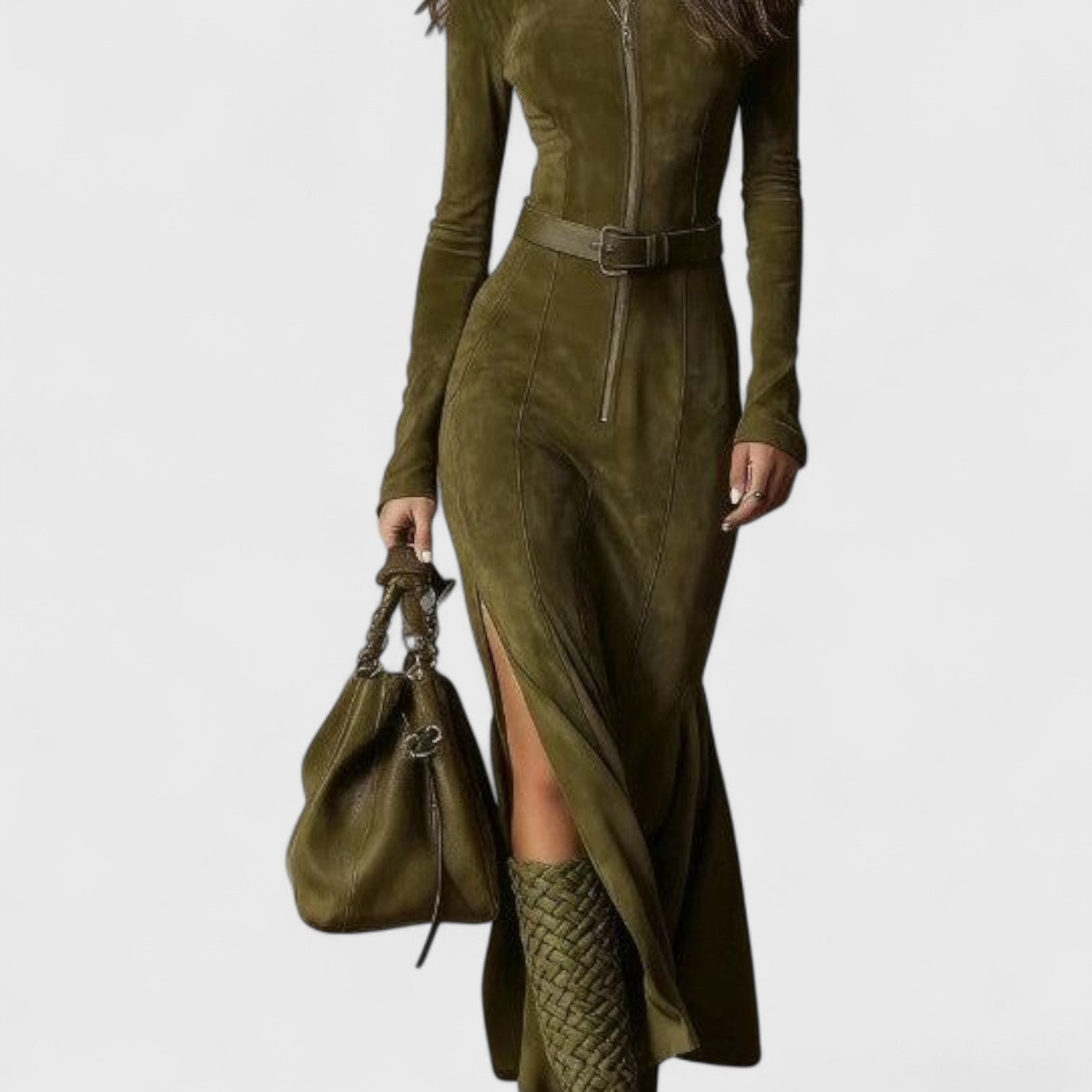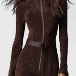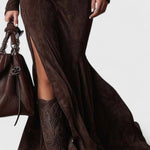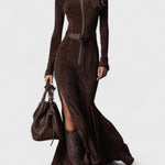 שדרגו את המלתחה שלכם עם שמלת מקסי חומה מרשימה זו, מעוצבת עם רוכסן אלגנטי מלפנים, חגורה במותניים וחצאית שסע זורמת. עשויה מבד זמש PU רך, ומשלבת קסם וינטג' עם נגיעה מודרנית. המחוך הצמוד מדגיש את הצללית שלכם, בעוד השסע הגבוה מוסיף נגיעה של תנועה וקסם. מושלמת גם ליציאות קז'ואליות וגם לערבים סטייטמנטריים.