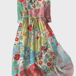 השמלה הארוכה המרשימה הזו בולטת בעיצוב הפאטשוורק המשחקי שלה בצבעים חיים, המשלבים ורוד, ירוק, תכלת וצהוב. הדוגמה הייחודית שלה עם פרחים ונקודות מוסיפה אווירה רטרו וכש魅力 מיוחדת, בעוד שהחגורה במותן מדגישה באלגנטיות את הסילואטה.