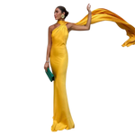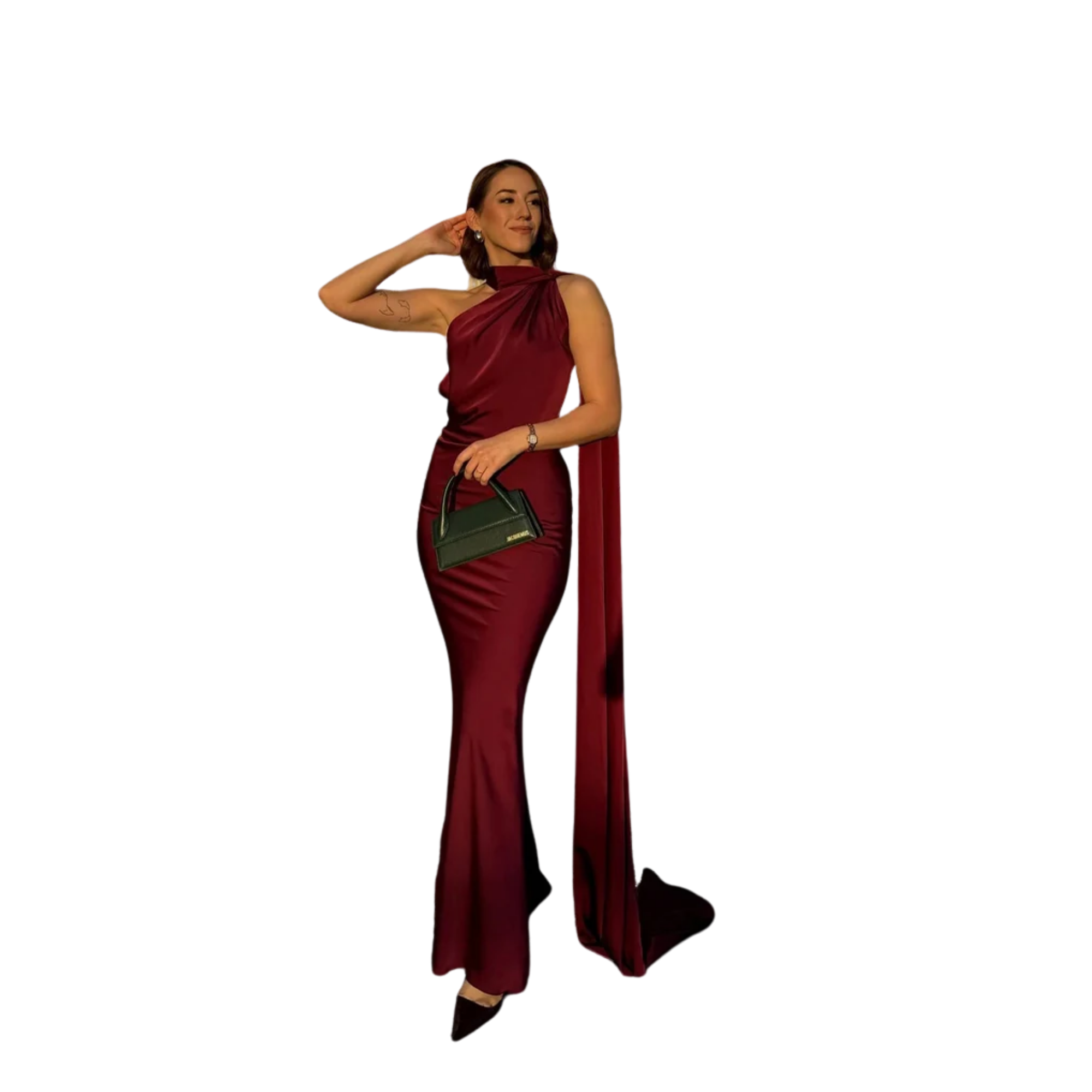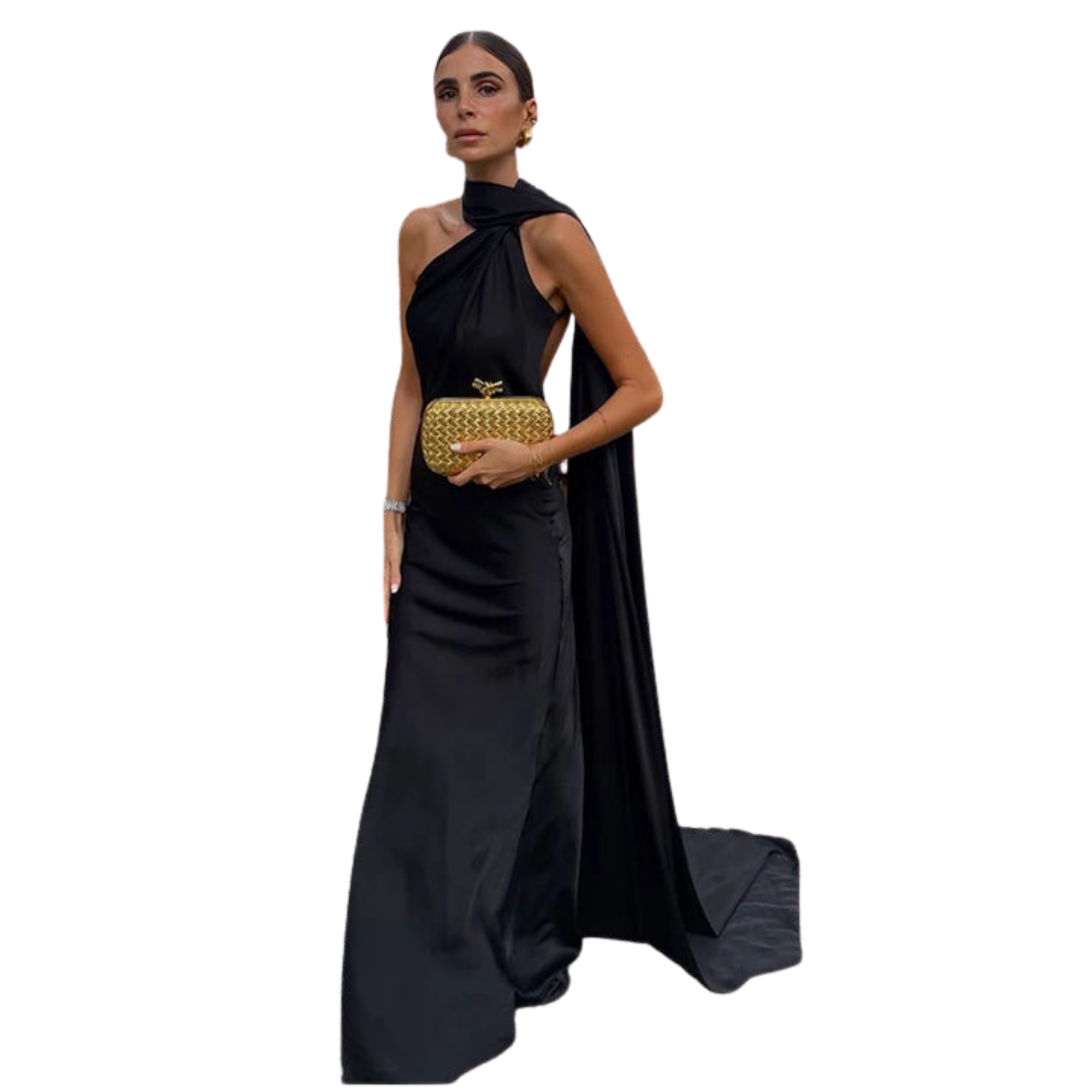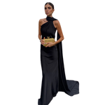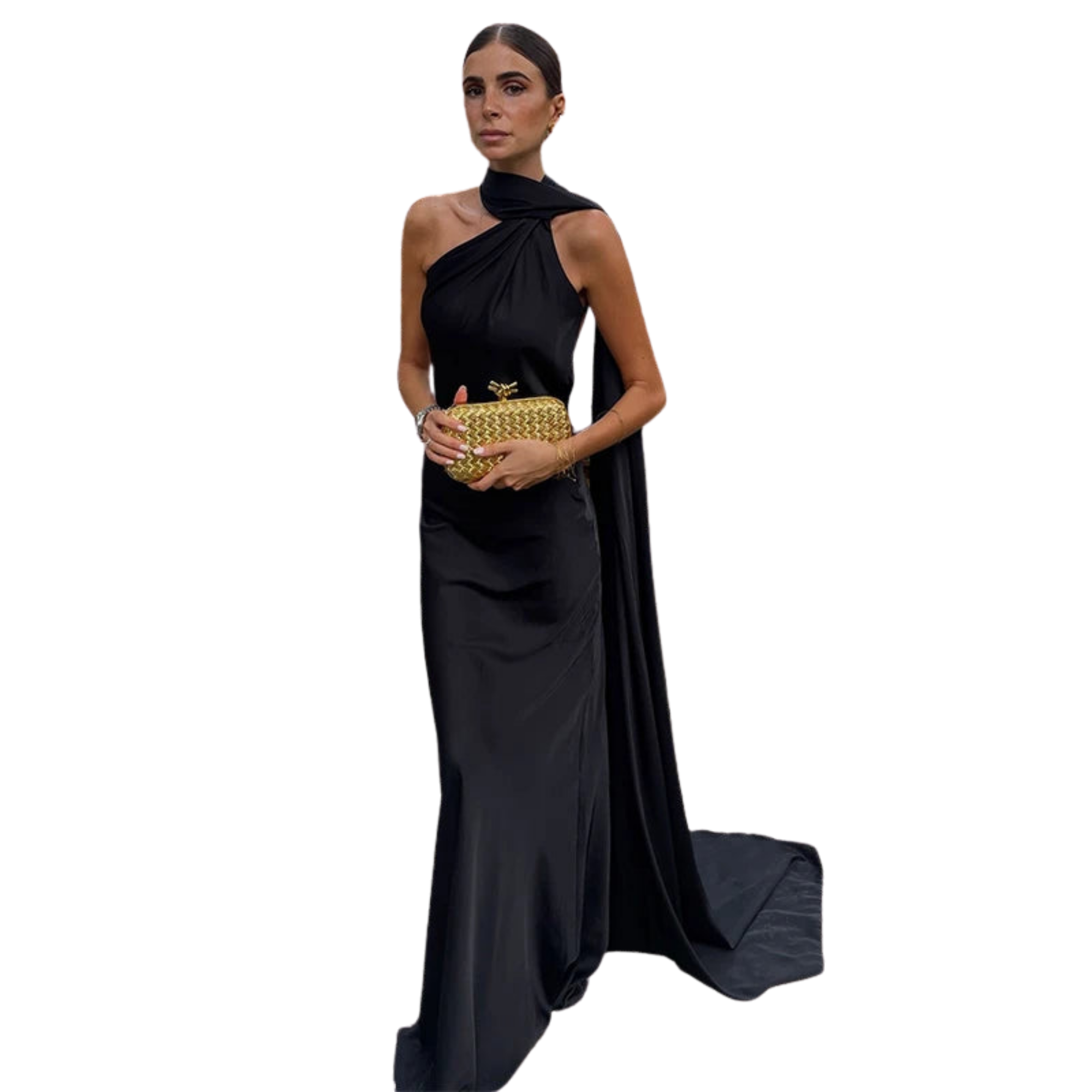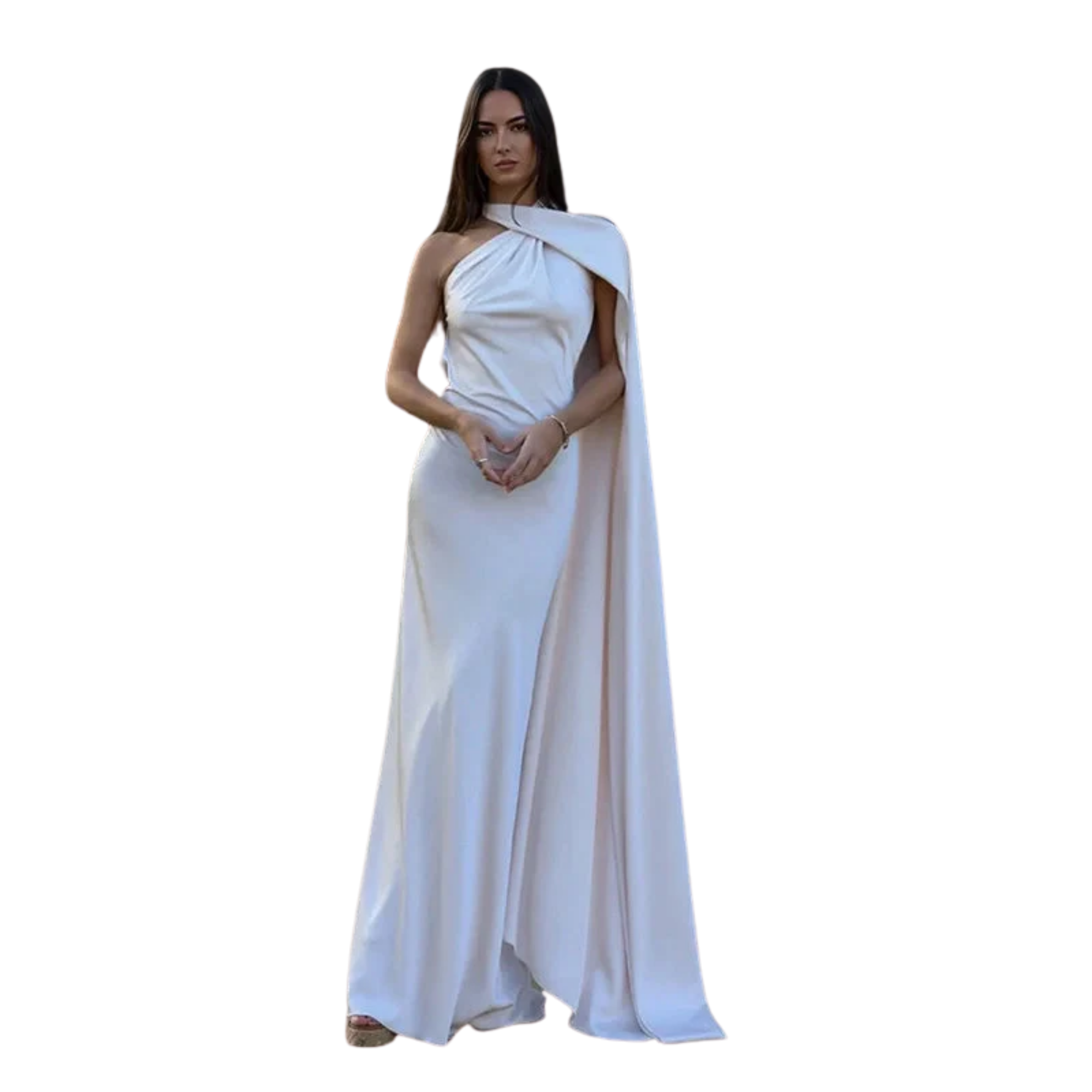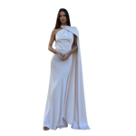 עיצוב דרמטי ומחמיא – גזרת כתף אחת עם פרט צעיף זורם שמאריך את הגזרה ומדגיש את עצם הבריח למראה אלגנטי וזוהר.