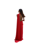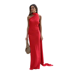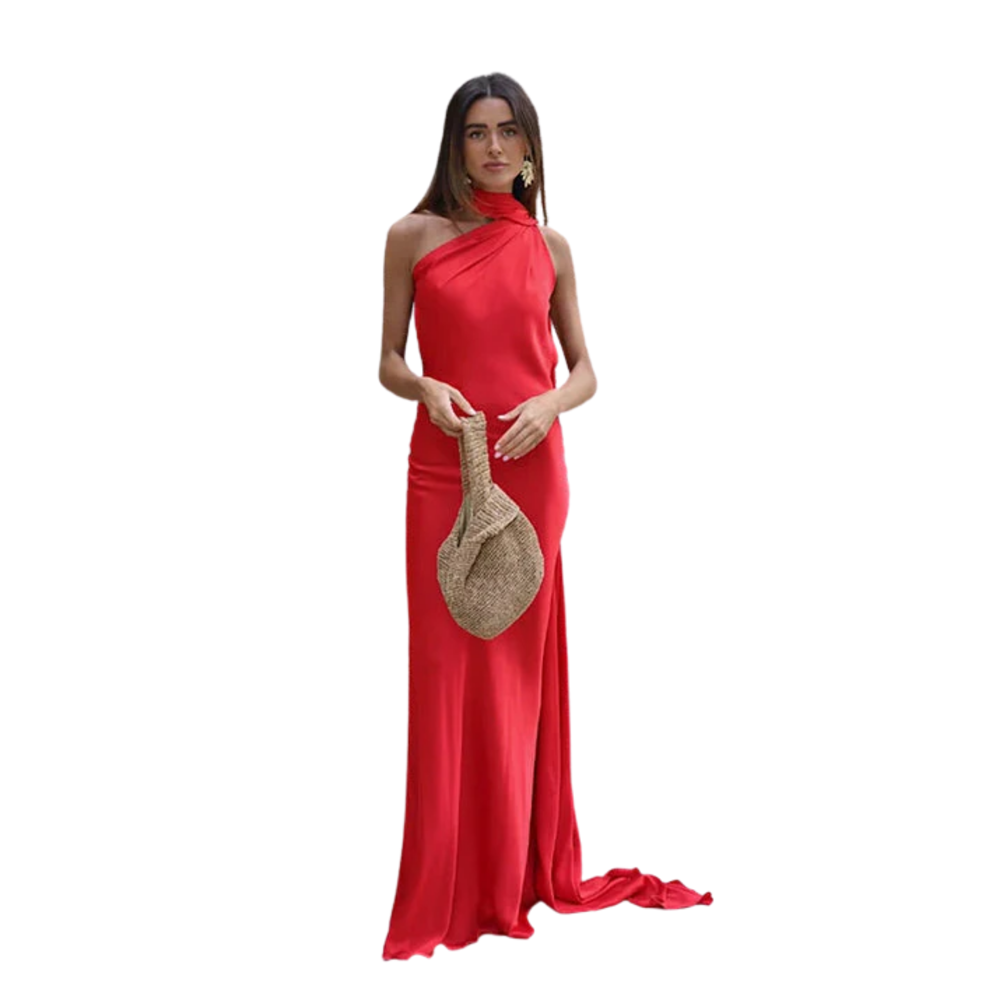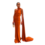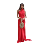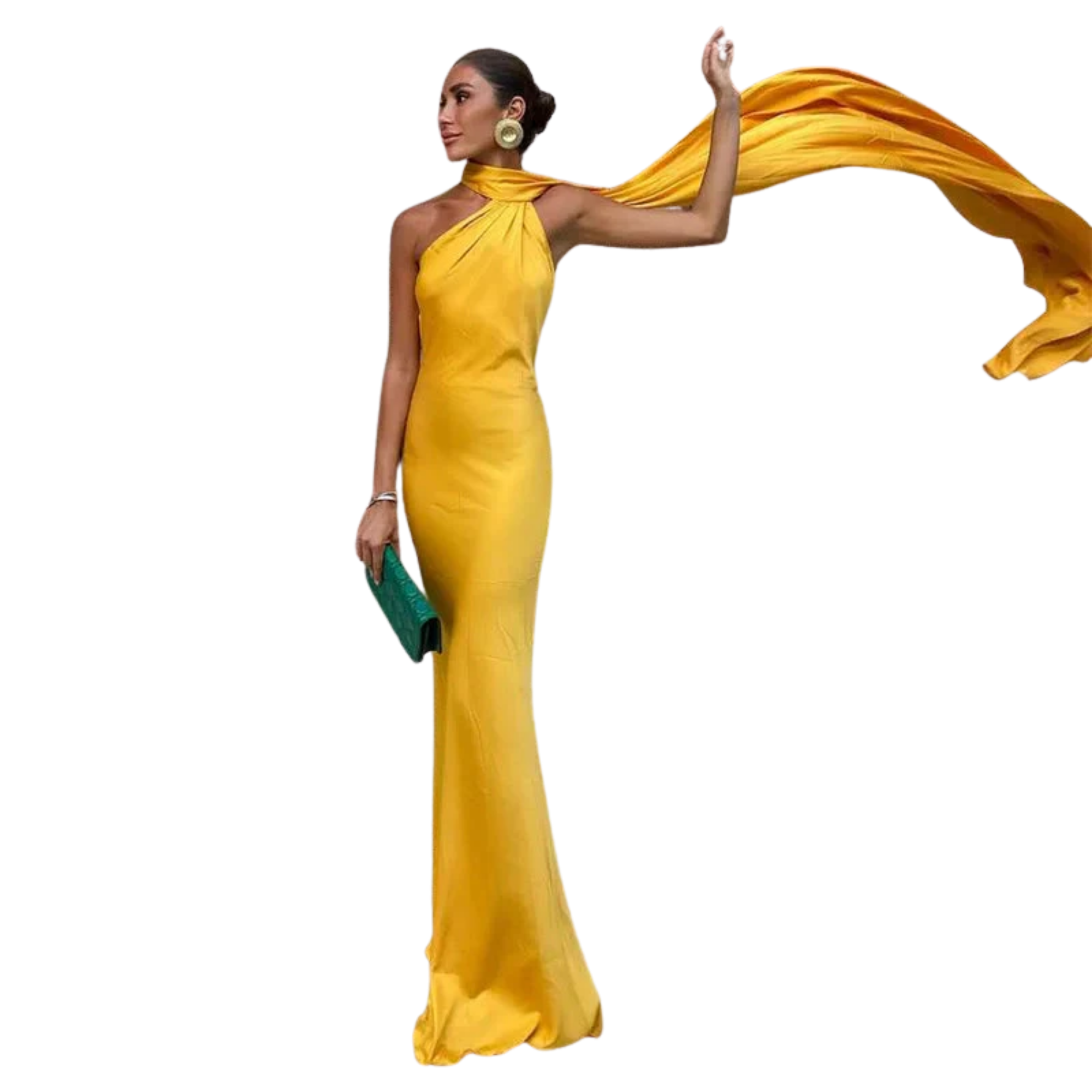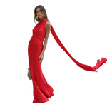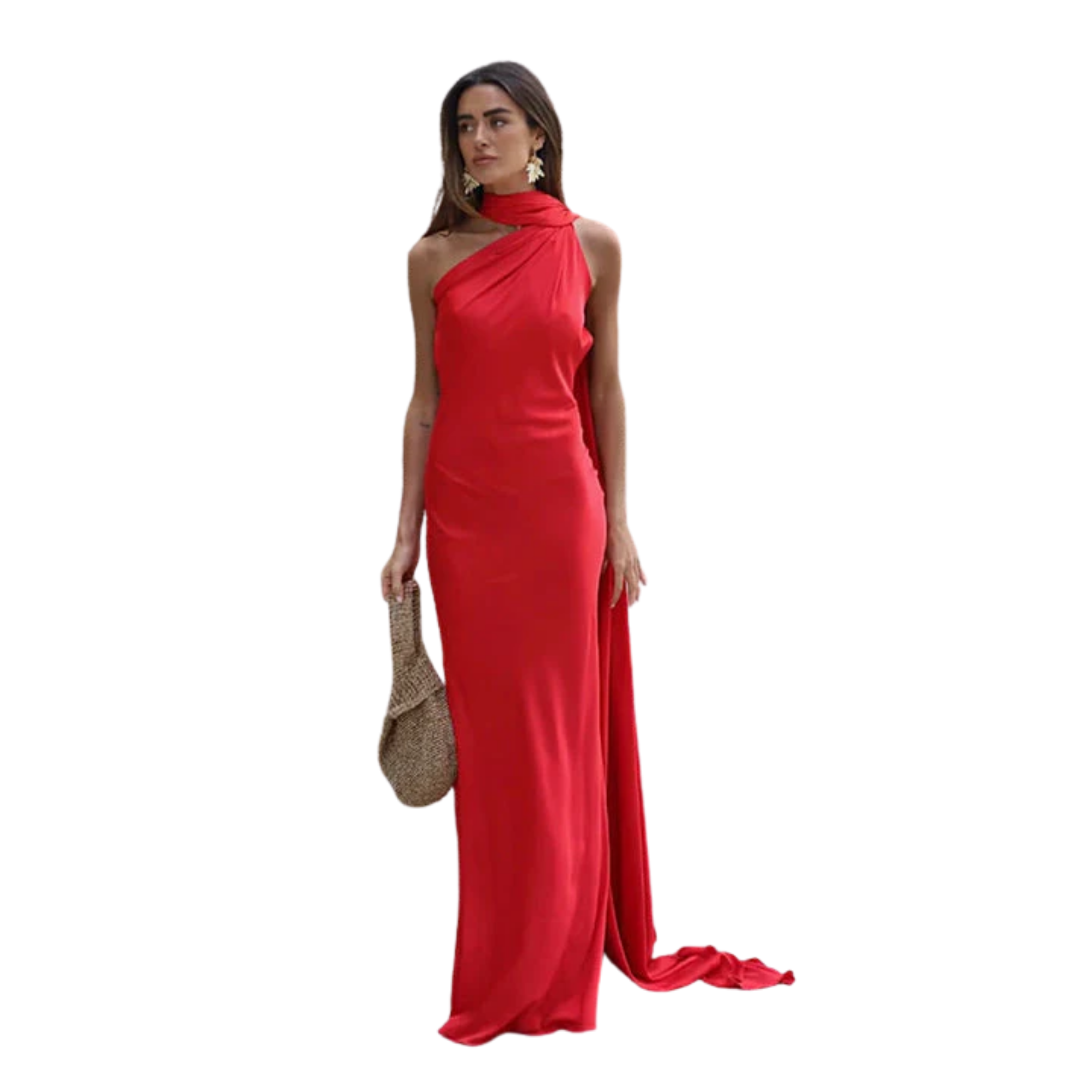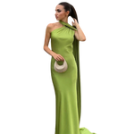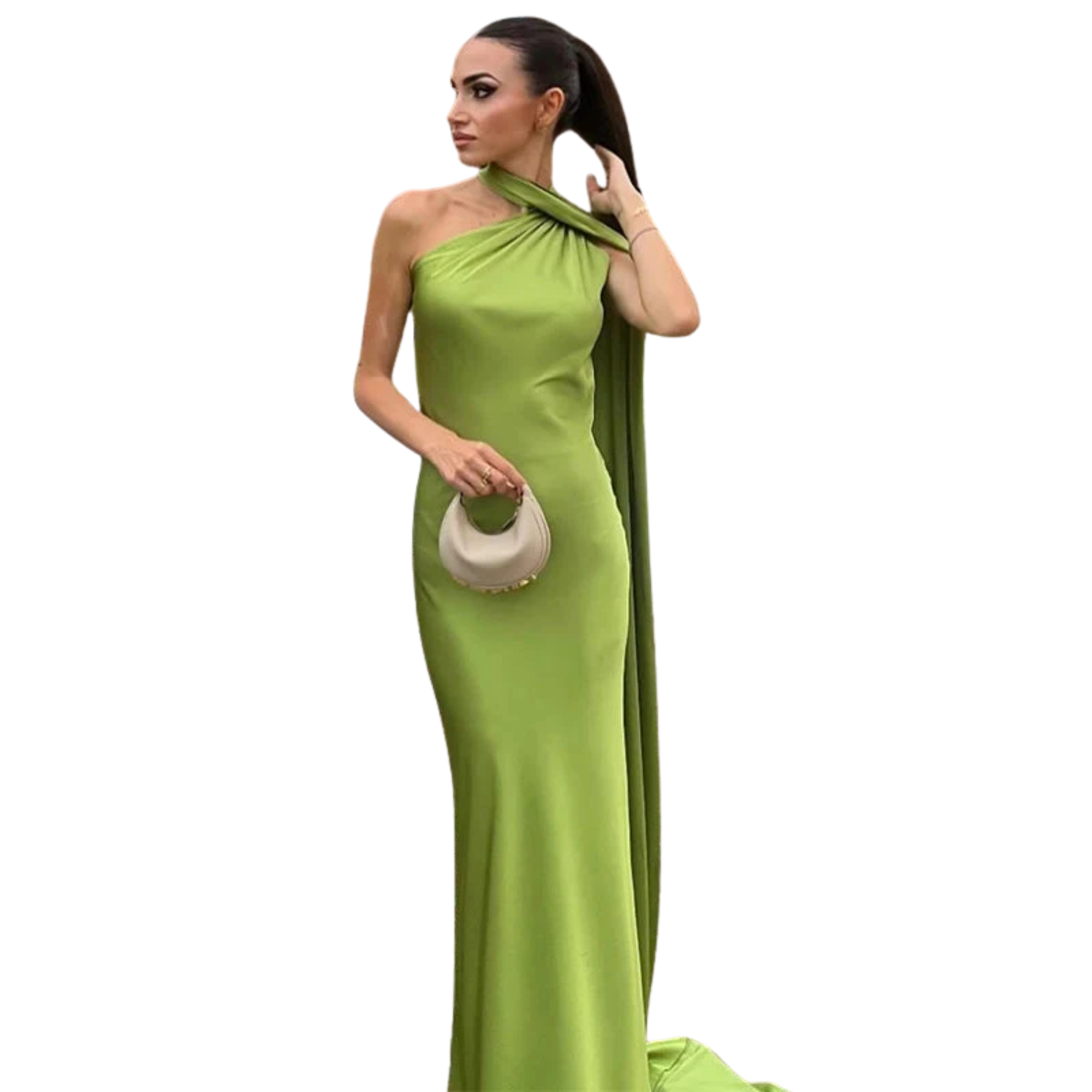 עיצוב דרמטי ומחמיא – גזרת כתף אחת עם פרט צעיף זורם שמאריך את הגזרה ומדגיש את עצם הבריח למראה אלגנטי וזוהר.
