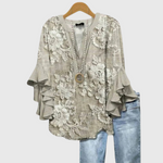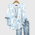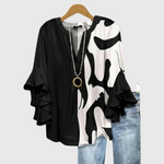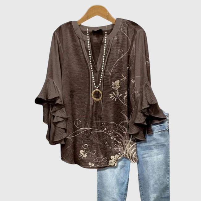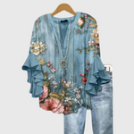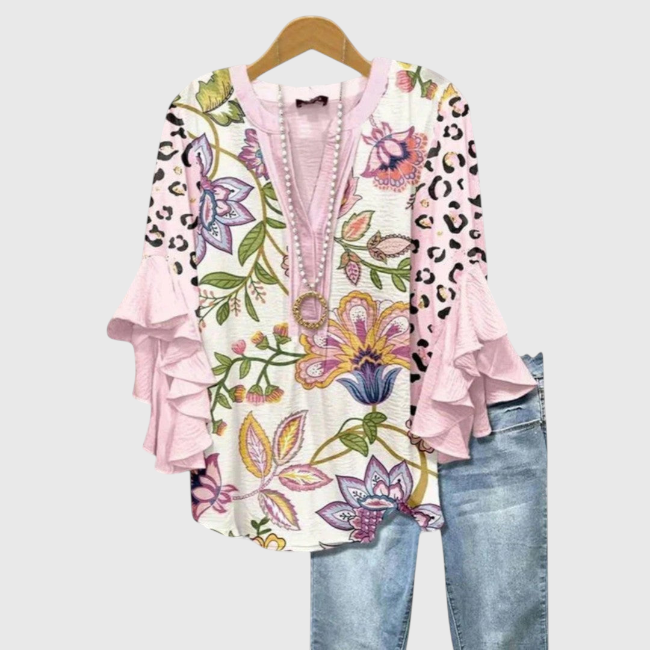 חולצה מרשימה ואומנותית שמשלבת אלגנטיות זורמת עם עיצוב ייחודי. הדפס הפרחים והשרוולים המדורגים מעניקים לה נוכחות בלתי נשכחת.