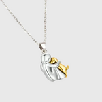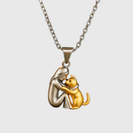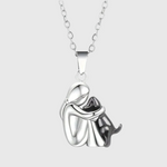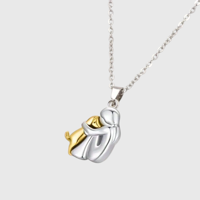 שרשרת ייחודית שמציגה אישה מחבקת את כלבה, סמל לאהבה ללא תנאים. מתנה מושלמת לאוהבי חיות שמביעה קשר עמוק ומיוחד.