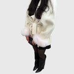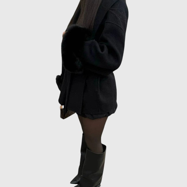 מעיל לינה משלב חום ואלגנטיות בעיצוב מחמיא עם חגורה רכה ושרוולי פרווה יוקרתיים.