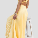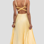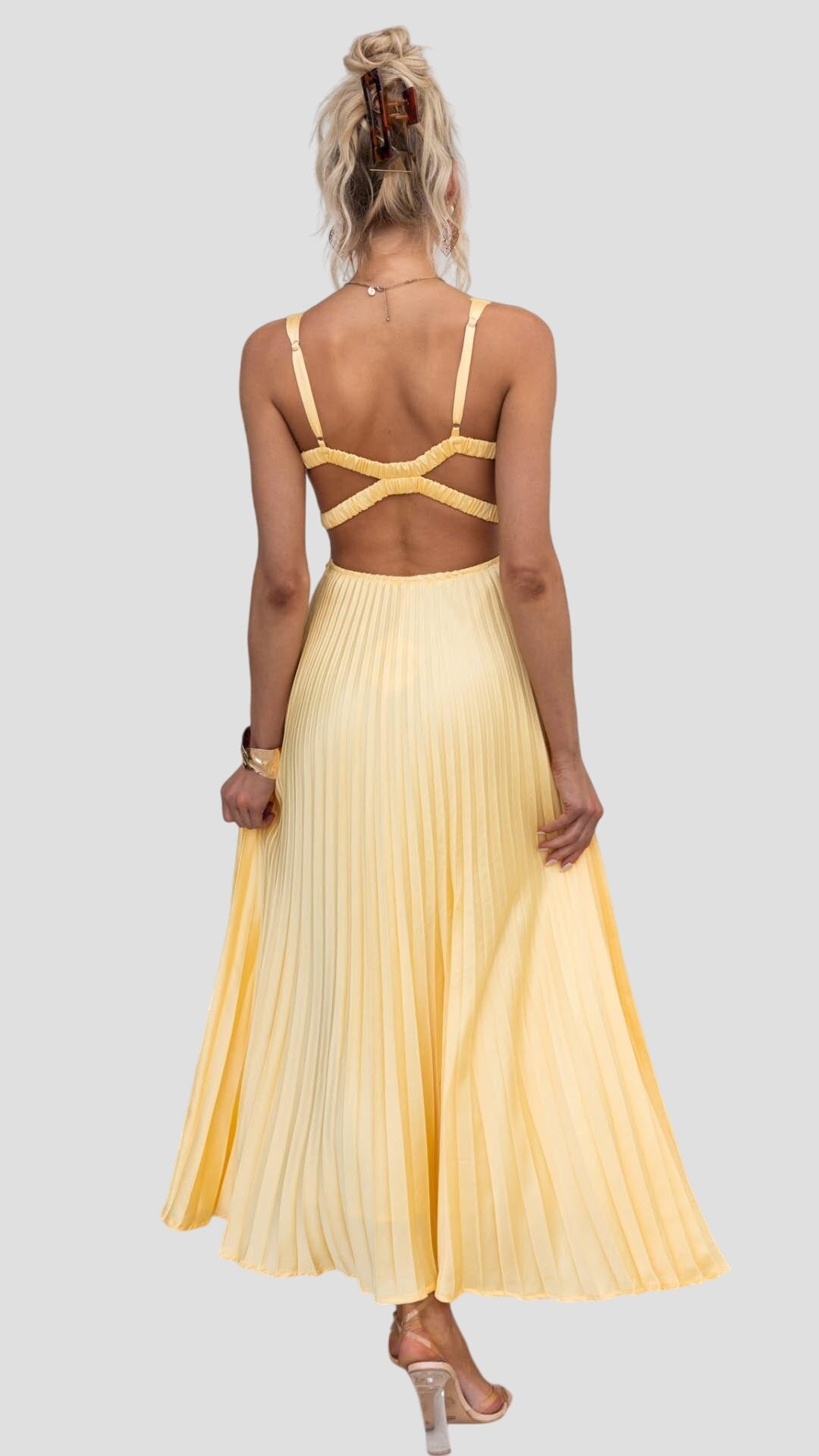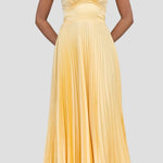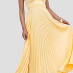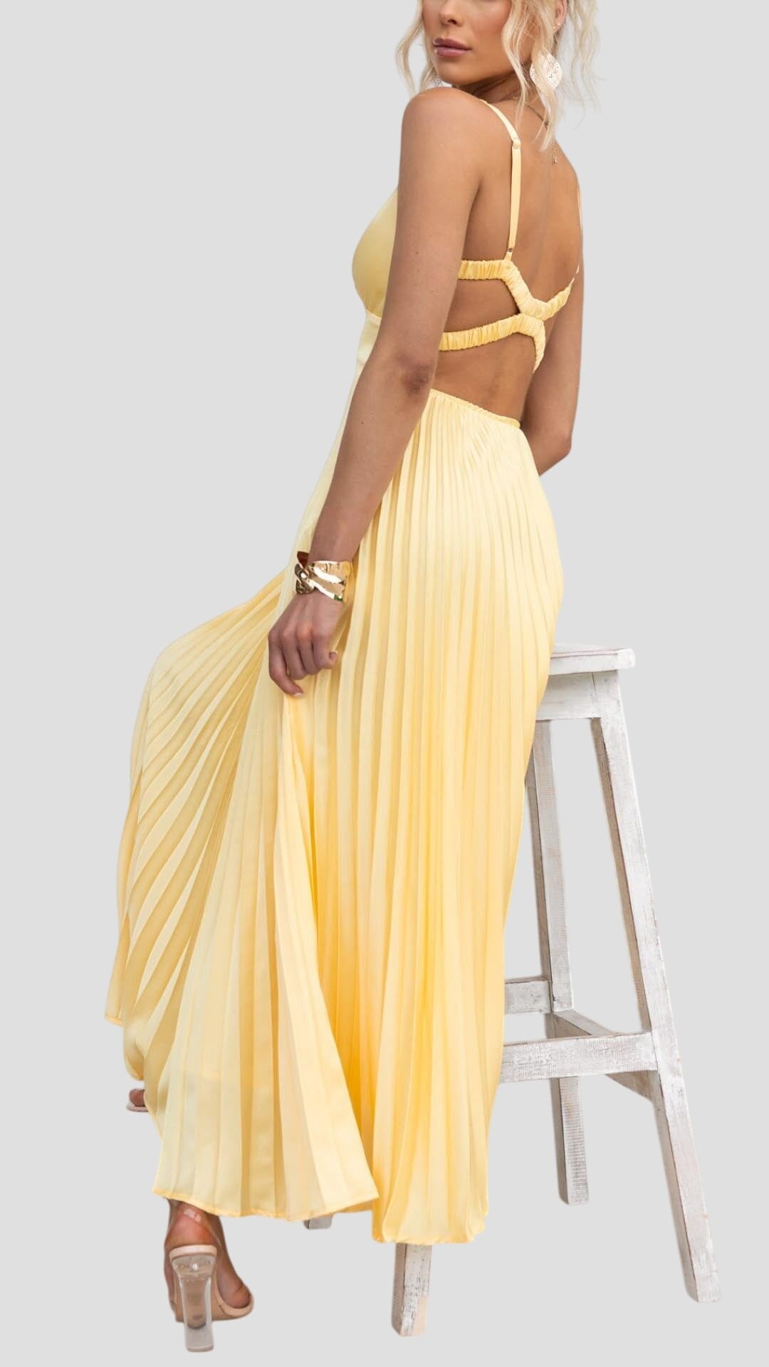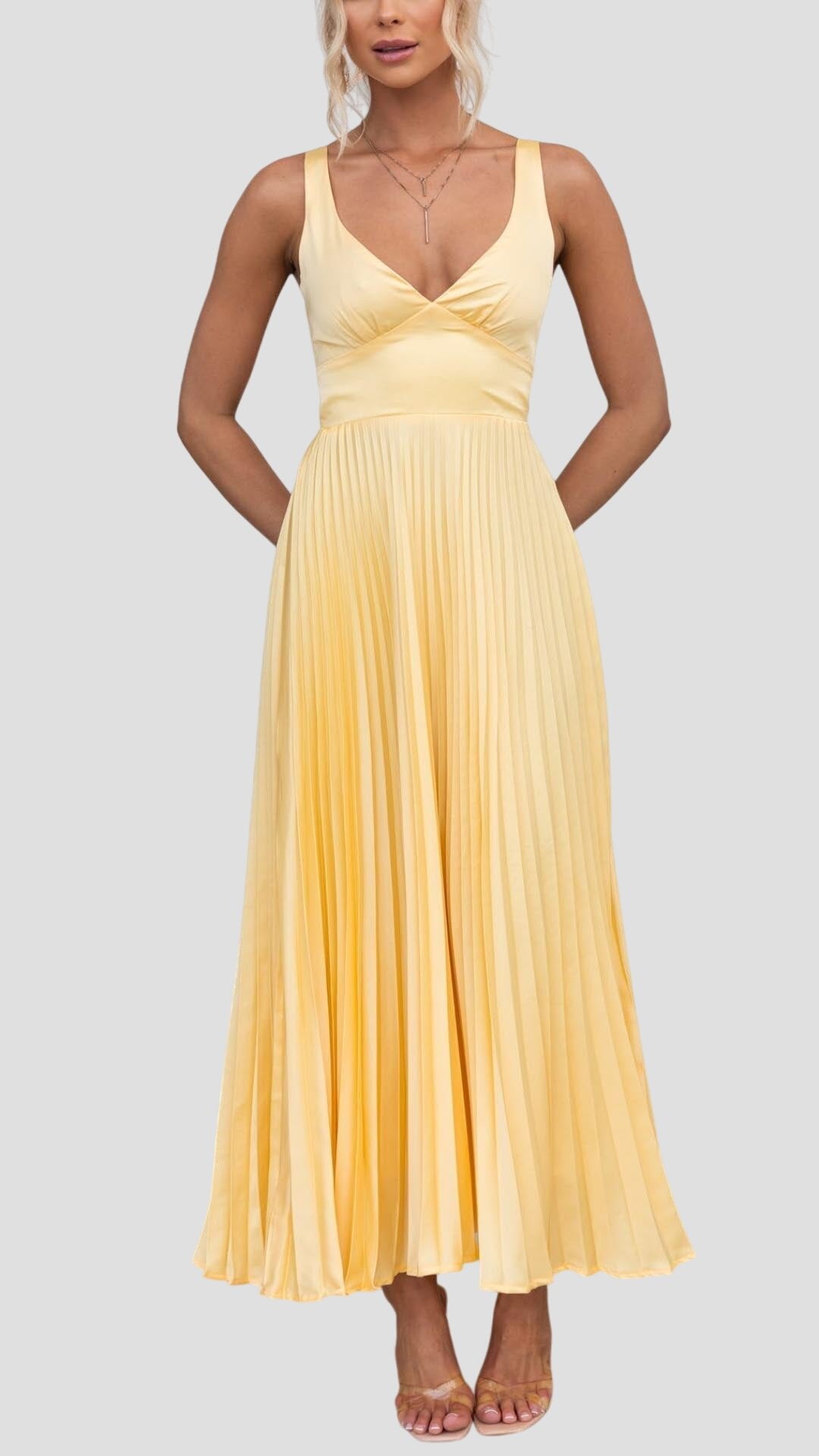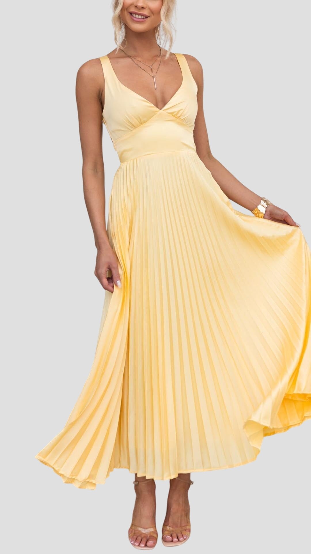צעדי אל האור עם שמלת המקסי הצהובה עם plis של אניקה, שבה אלגנטיות פוגשת נגיעה מודרנית.