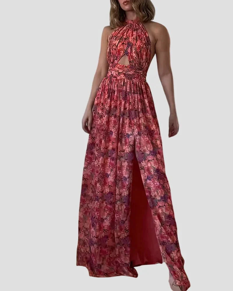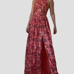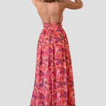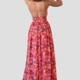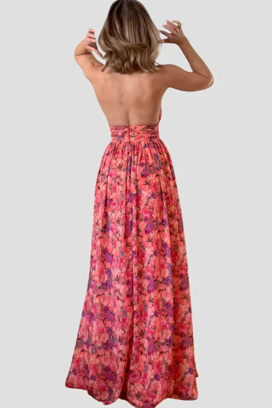 שמלת המקסי ללא גב עם ההדפס הפרחים של מיסה לונה היא הכרטיס שלך לאלגנטיות ללא מאמץ והרפתקאות בשמש.